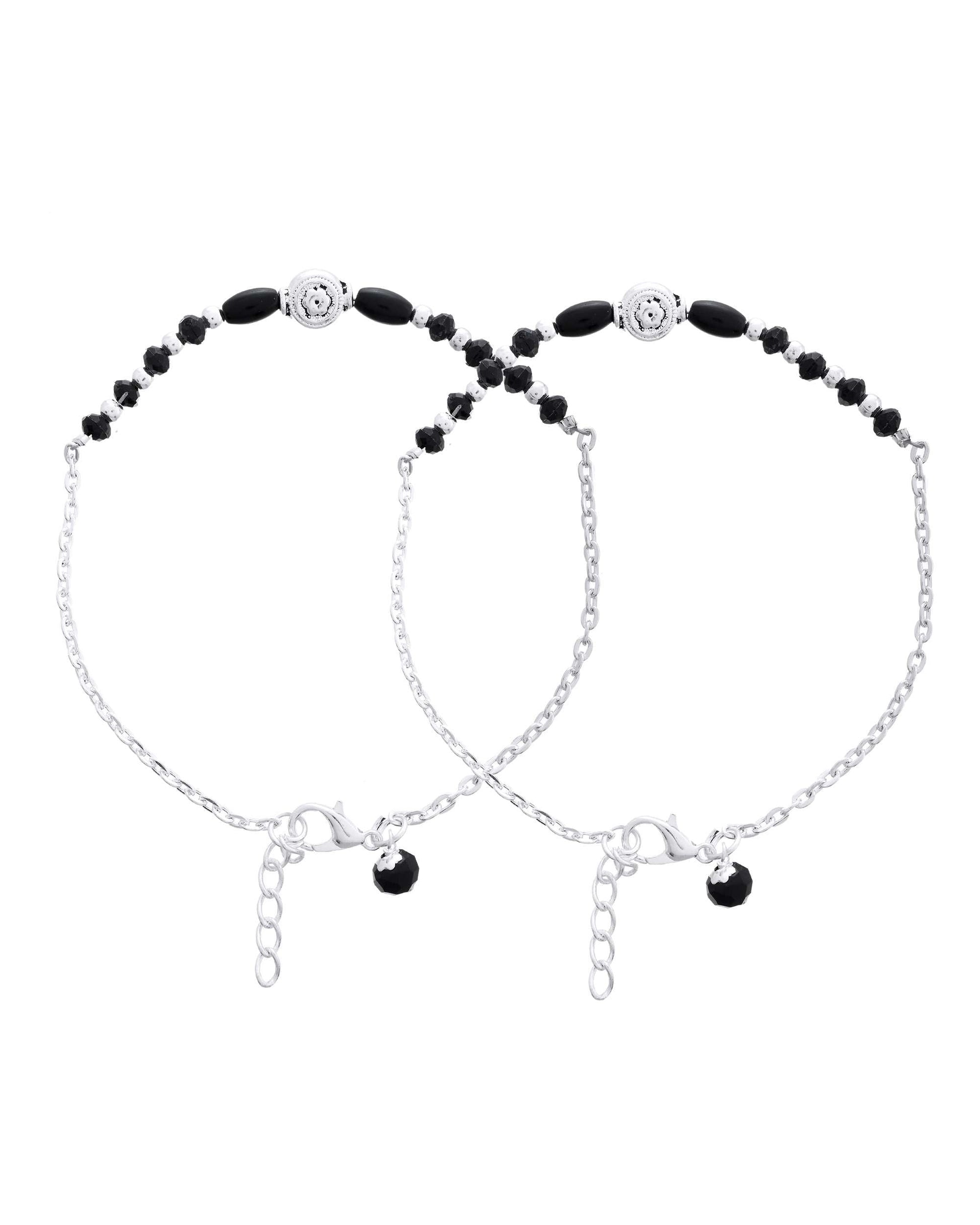 Jewels Nest Set of 2 Silver-Plated Stainless Steel Beaded Anklets with Artificial Black Stones & Floral Charms