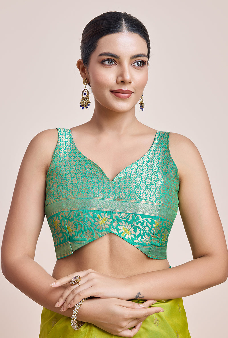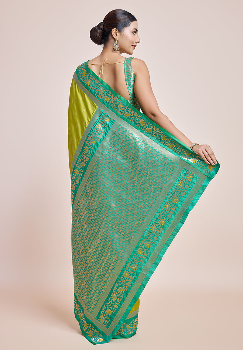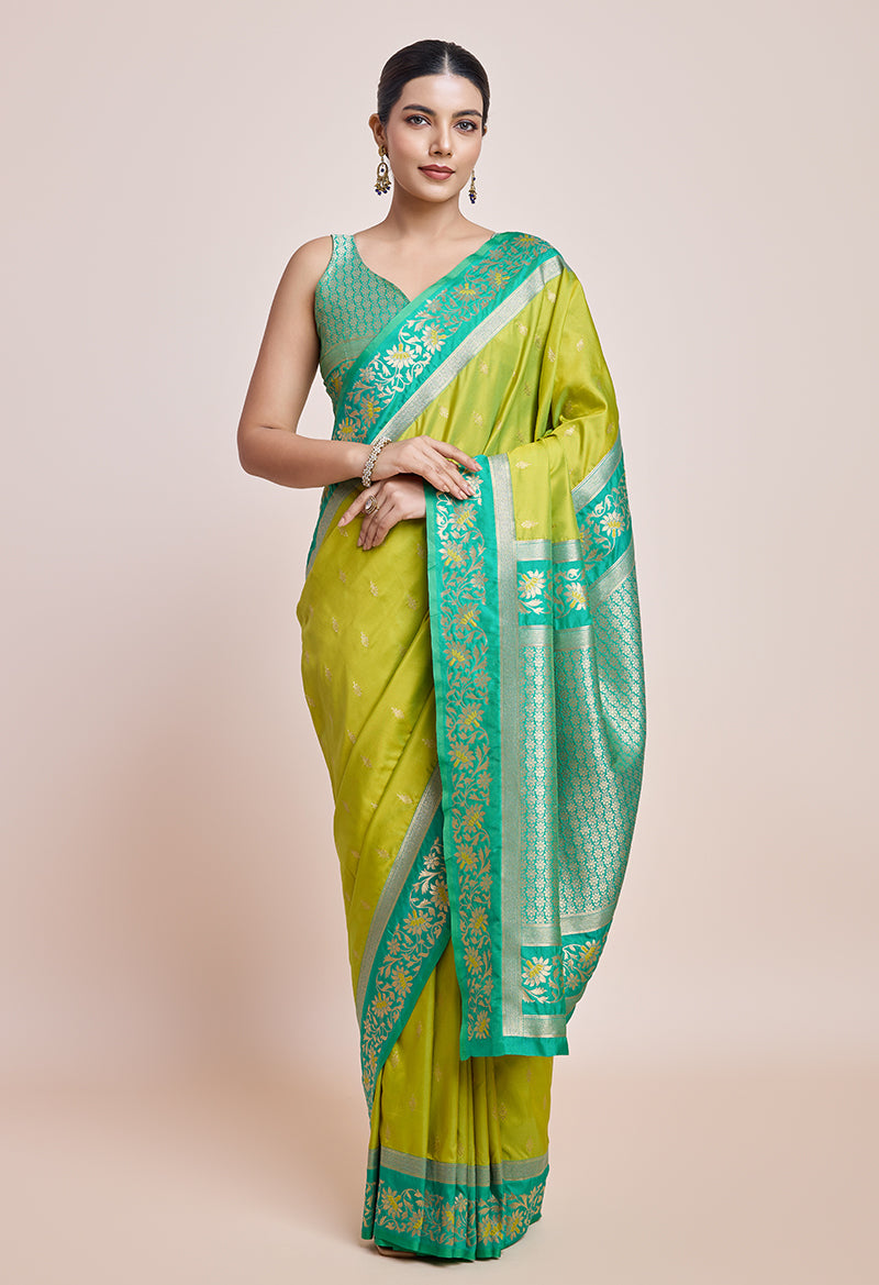 Monjolika Fashion Parrot Green Banarasi Silk In Satin Is Classy Embellished With Golden Zari Work Saree