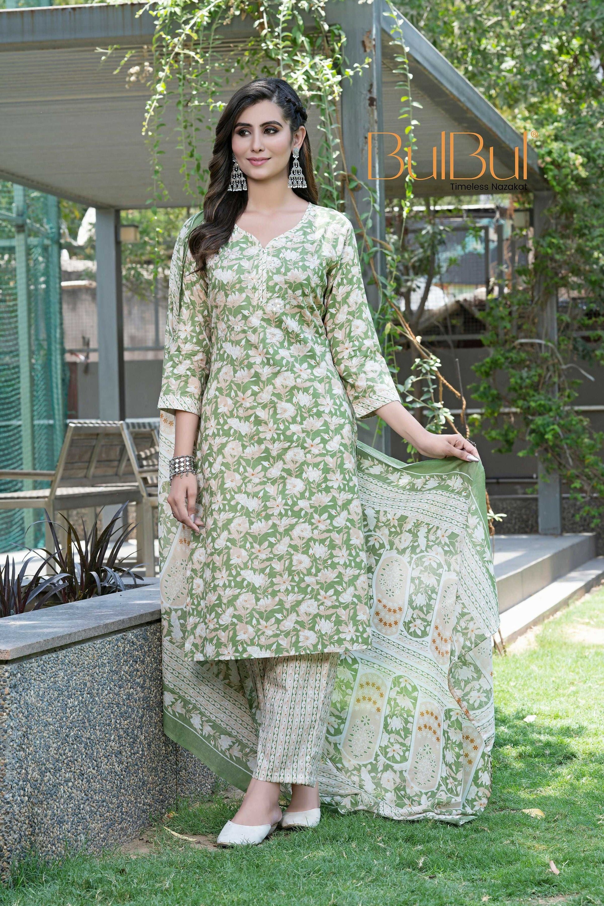 BulBul Fashionista Green Floral Cotton Kurta Set with Dupatta