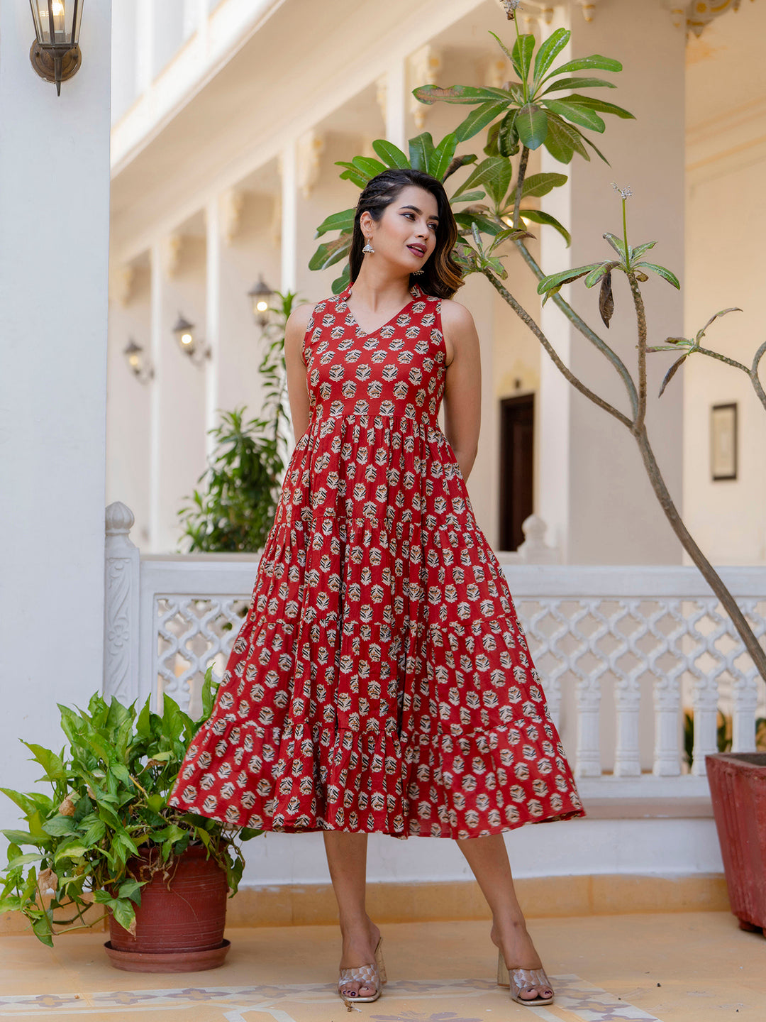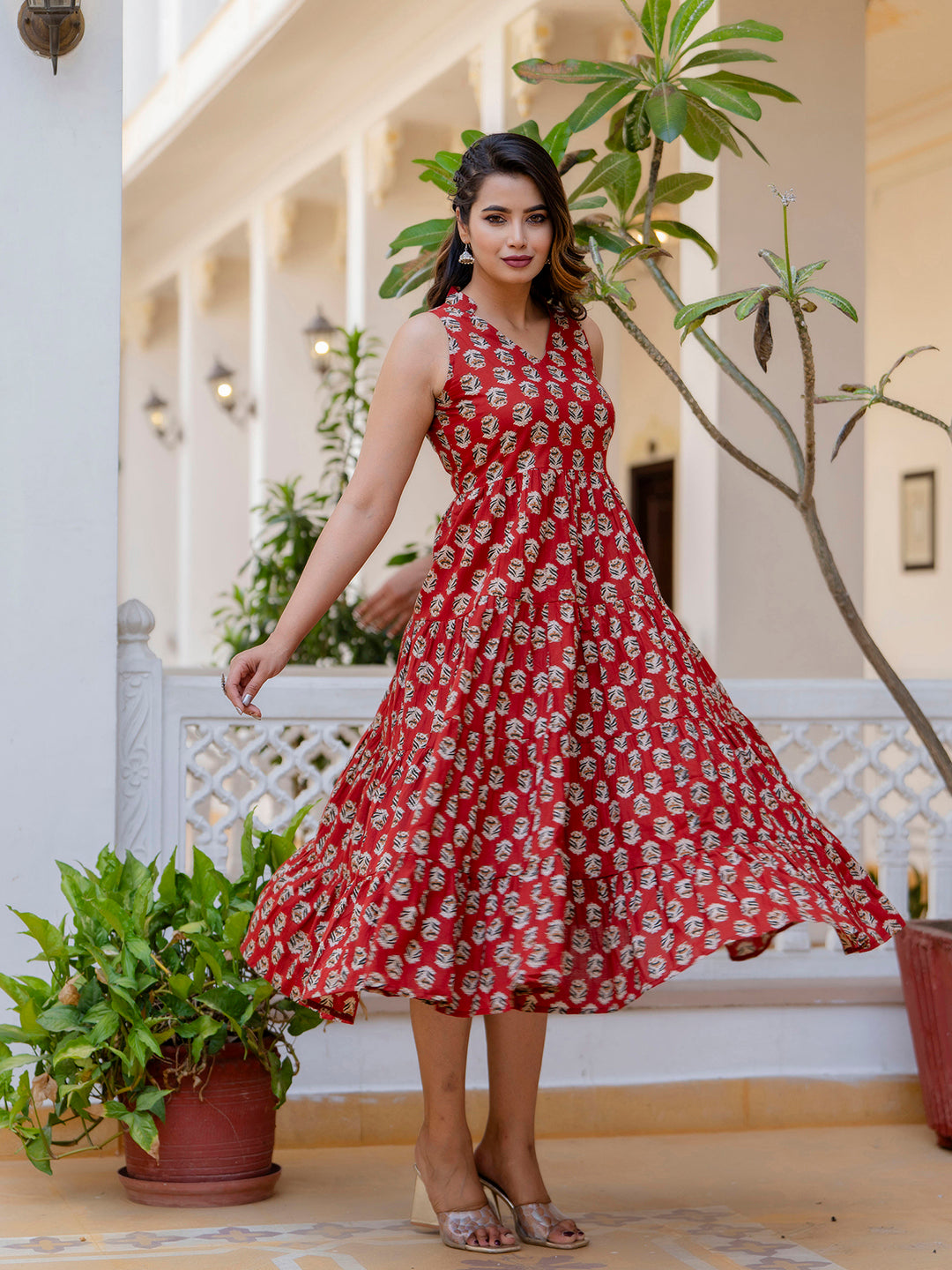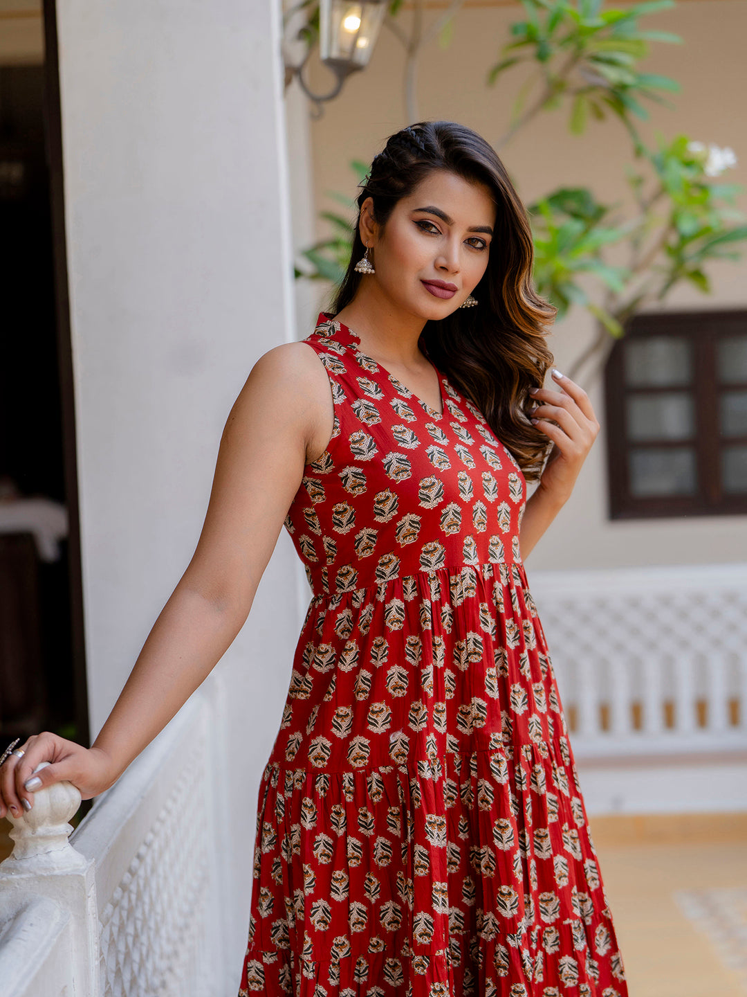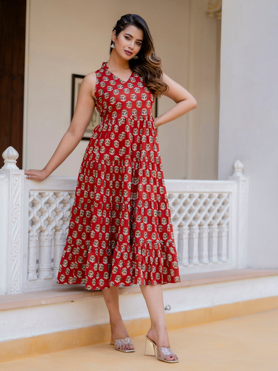 Antaran Maroon Pure Cotton Tiered Printed Dress
