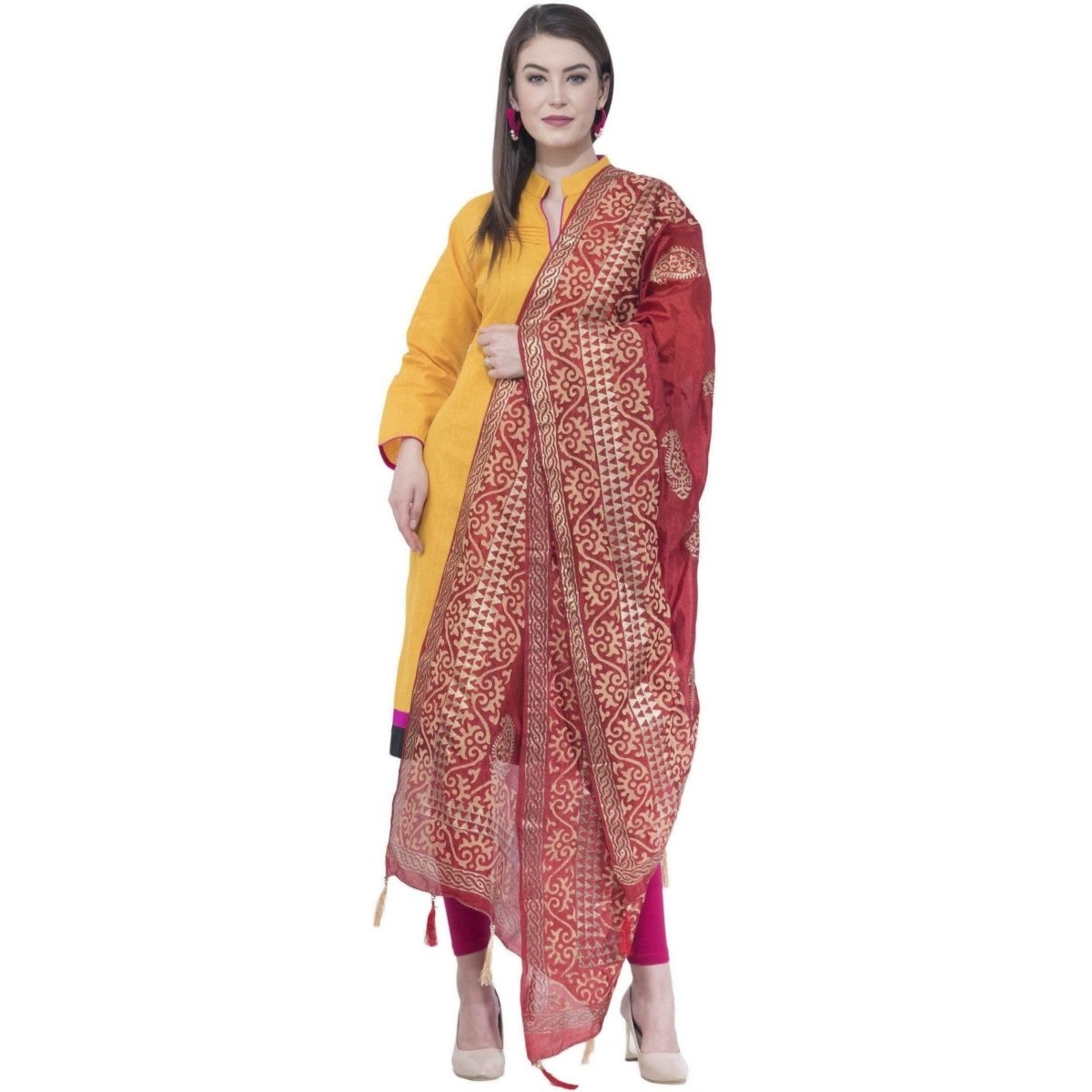 A R Silk Women's Gold Print Silk Mehroon Dupattas and Chunnis: