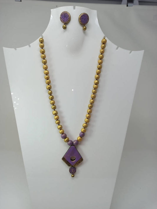 Terracotta Diamond Pendant Long Necklace Set With Studs-Lavender