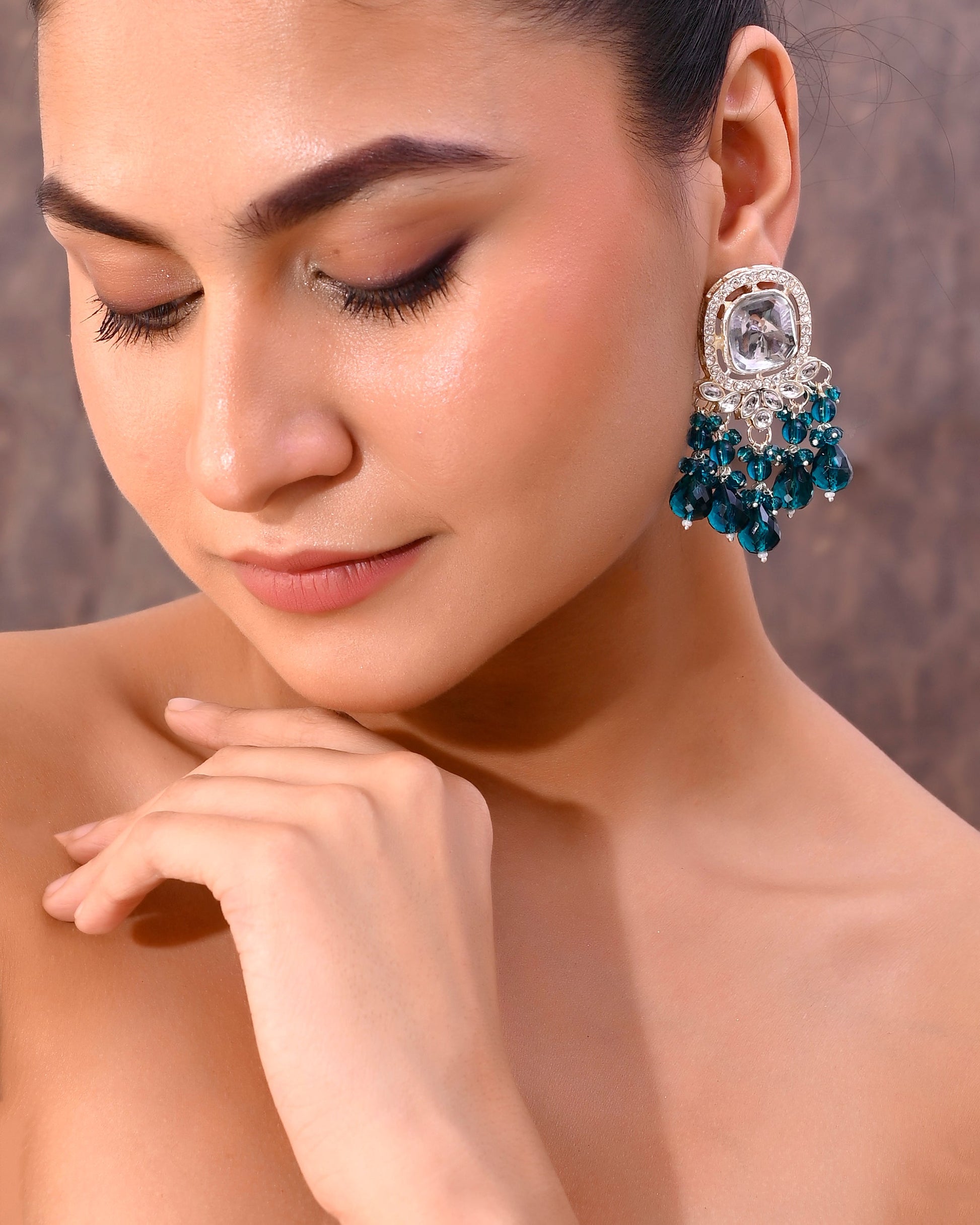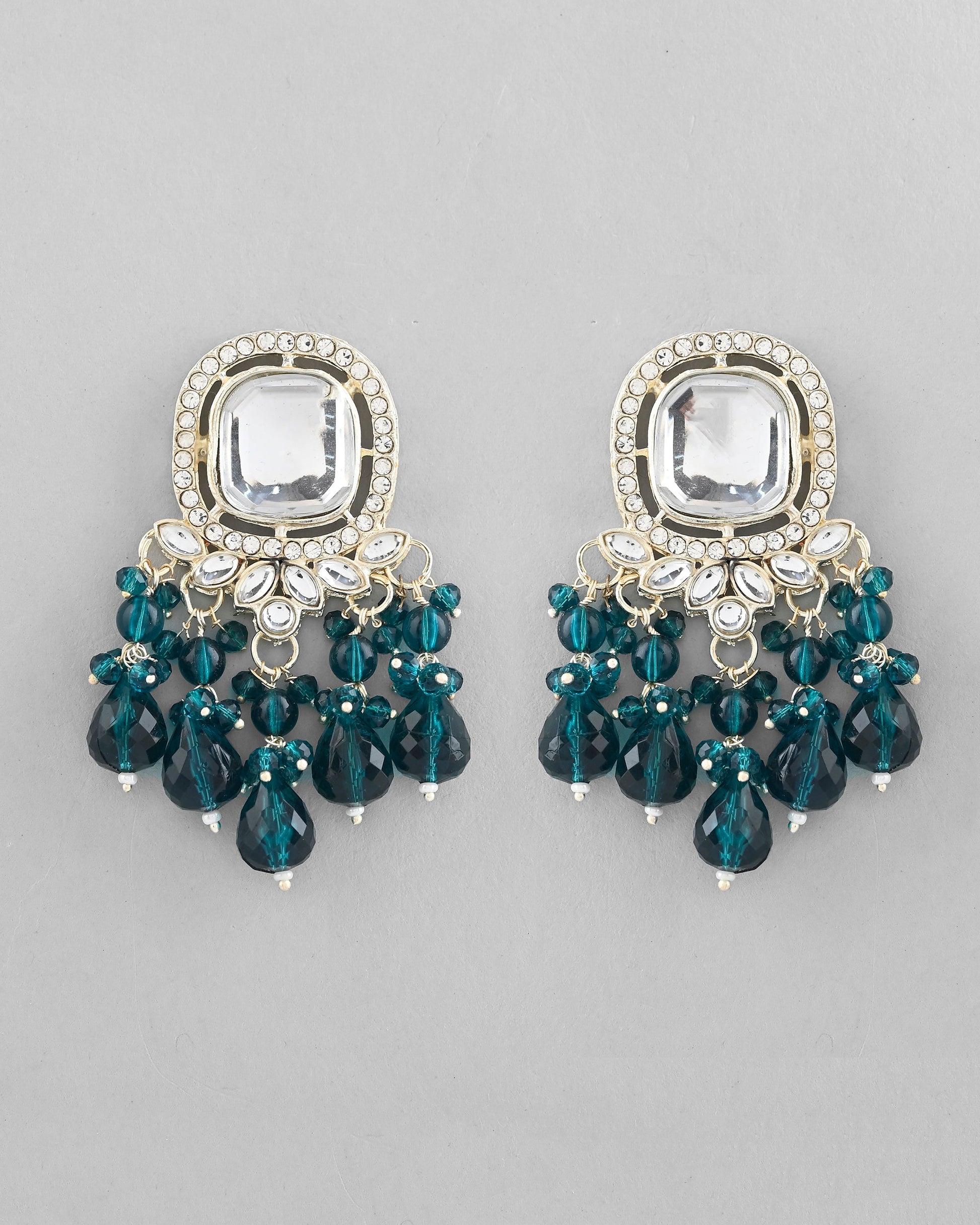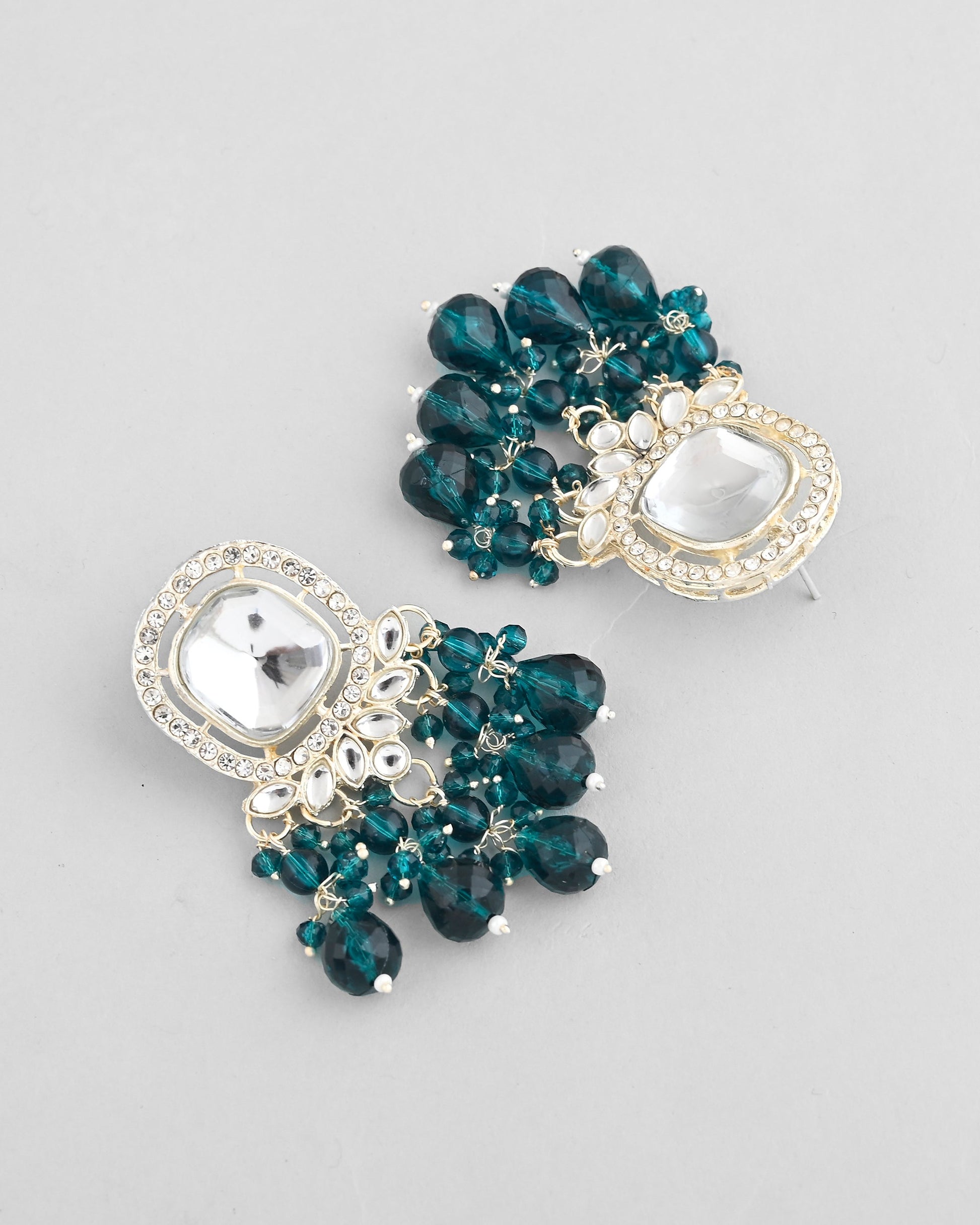 VOJ Silver Plated Kundan Earrings with Teal colour Pearls