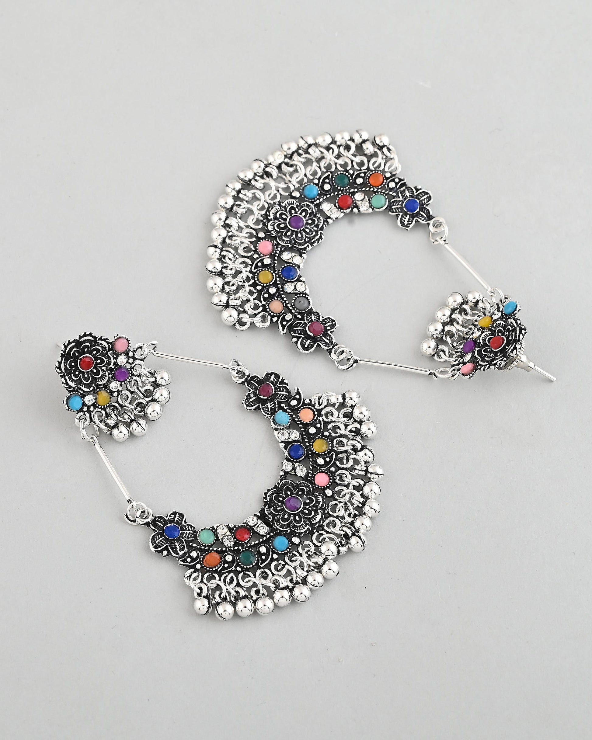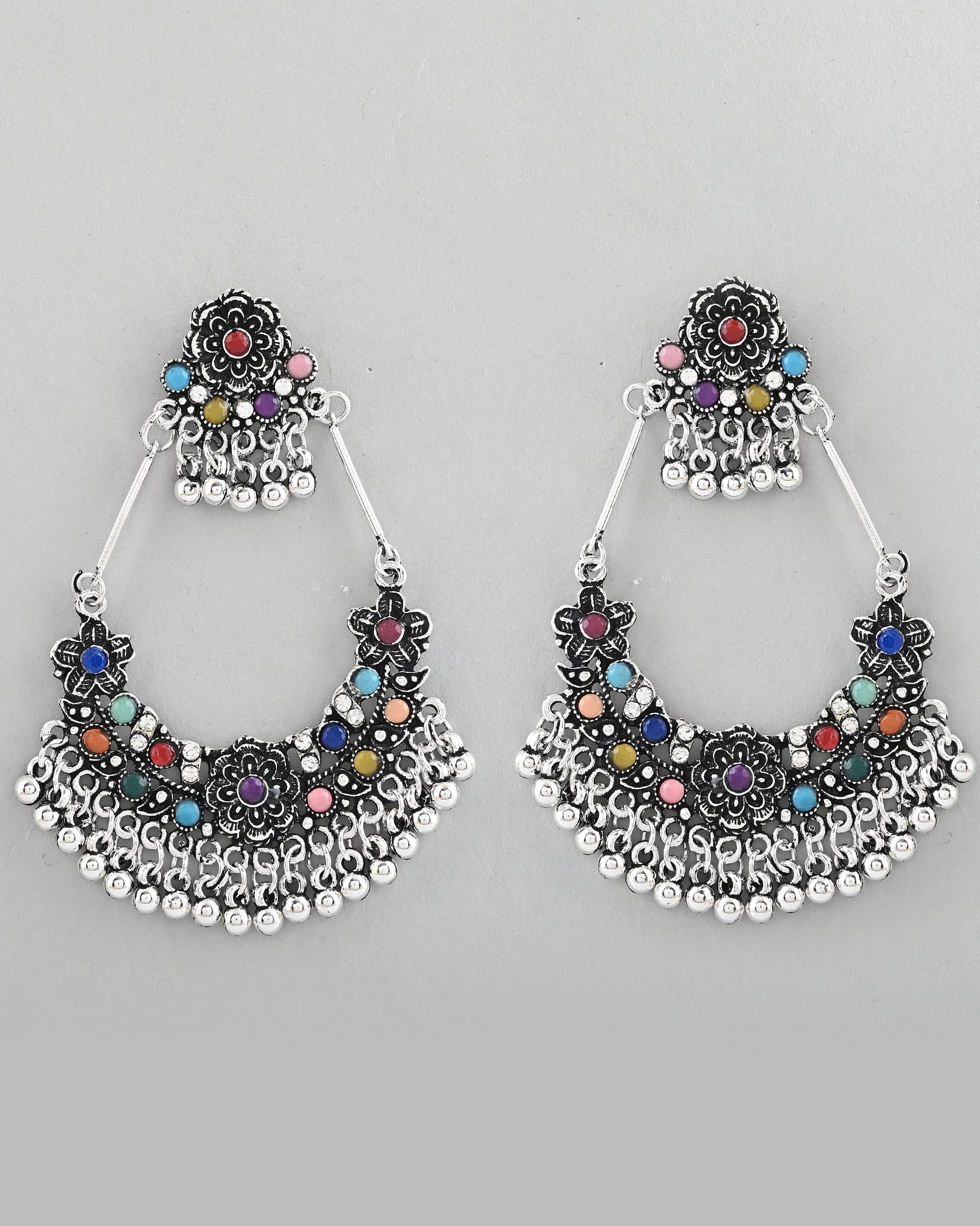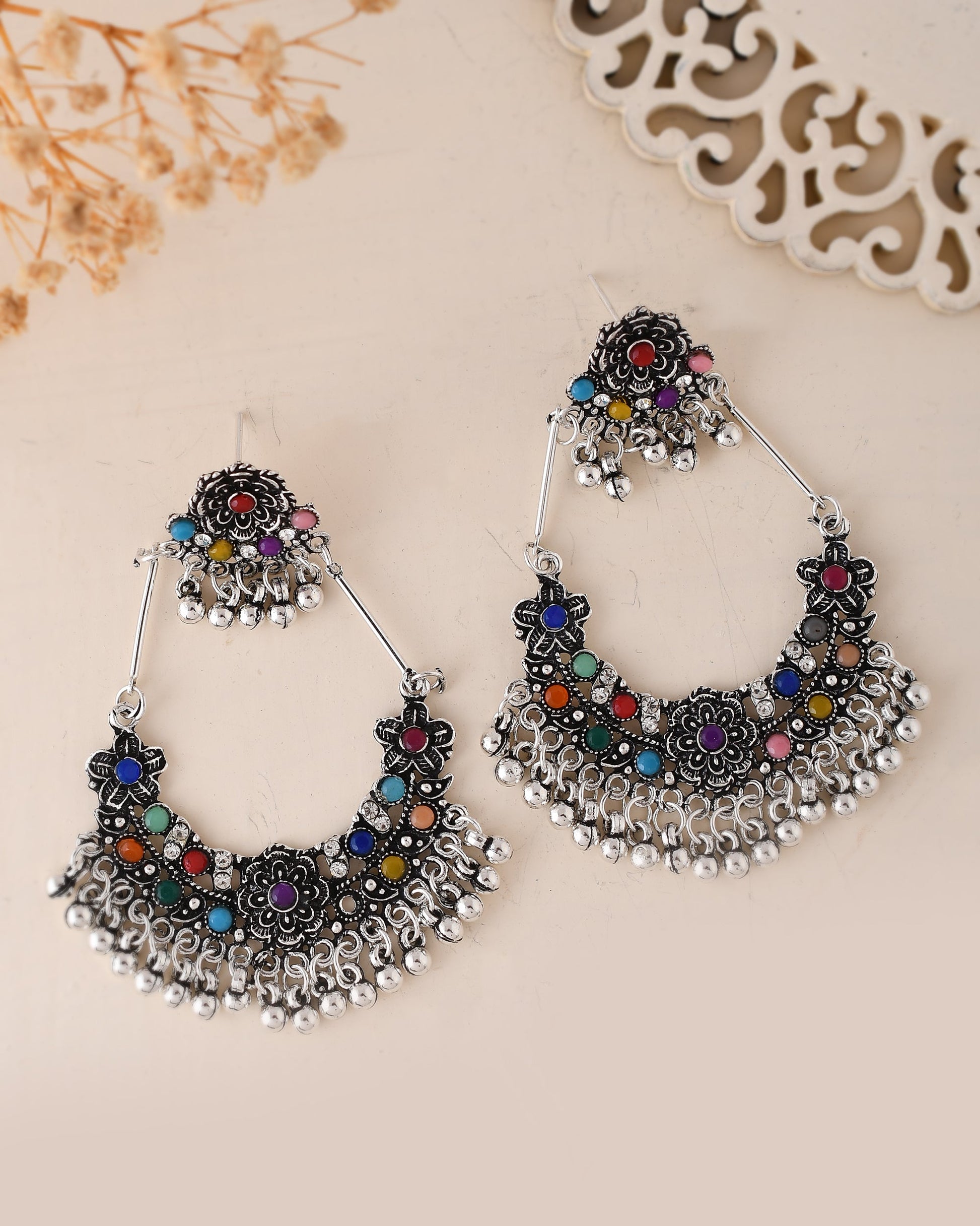 VOJ Silver-Plated multi Colour Flower Oxidized Shaped Drop Earrings