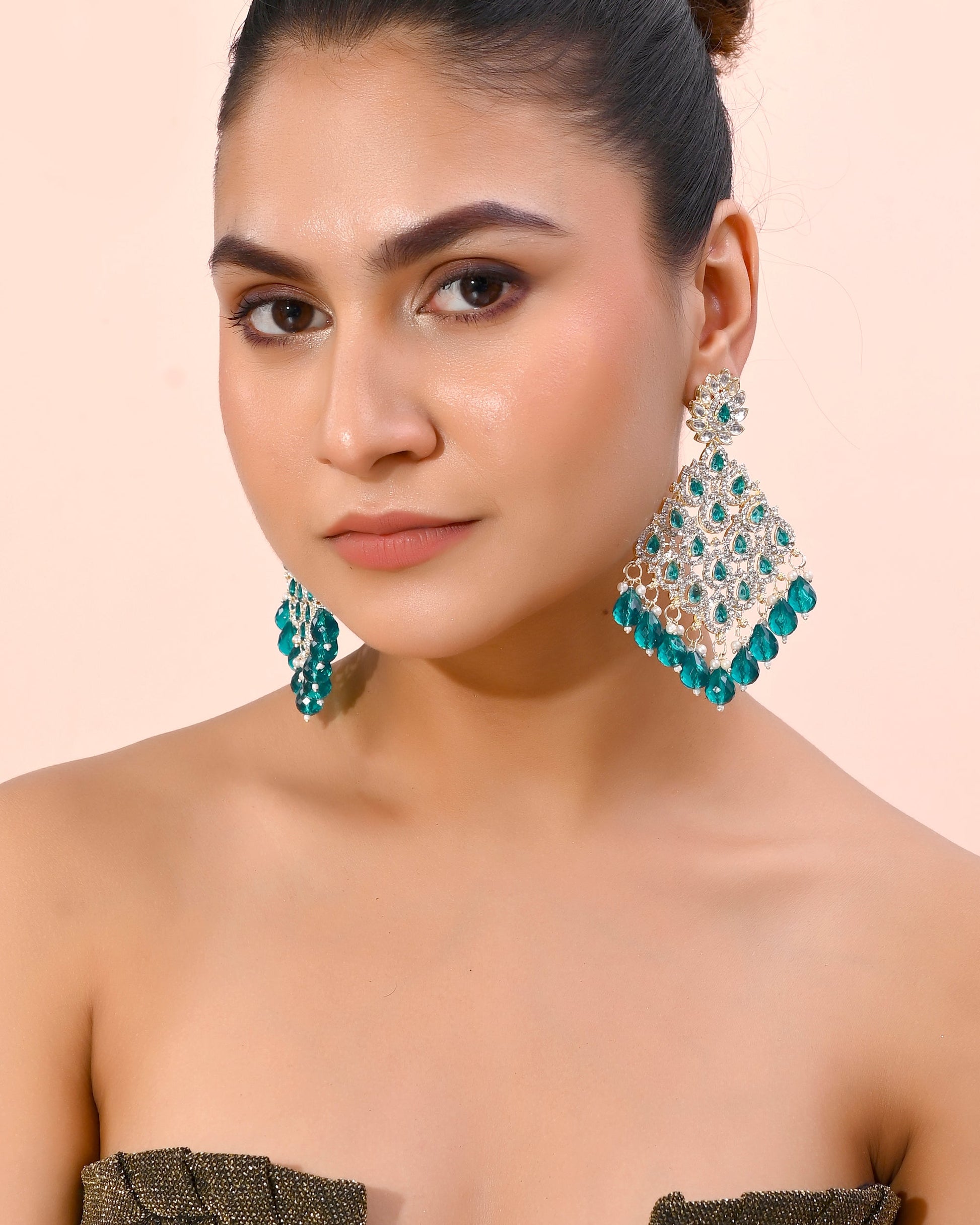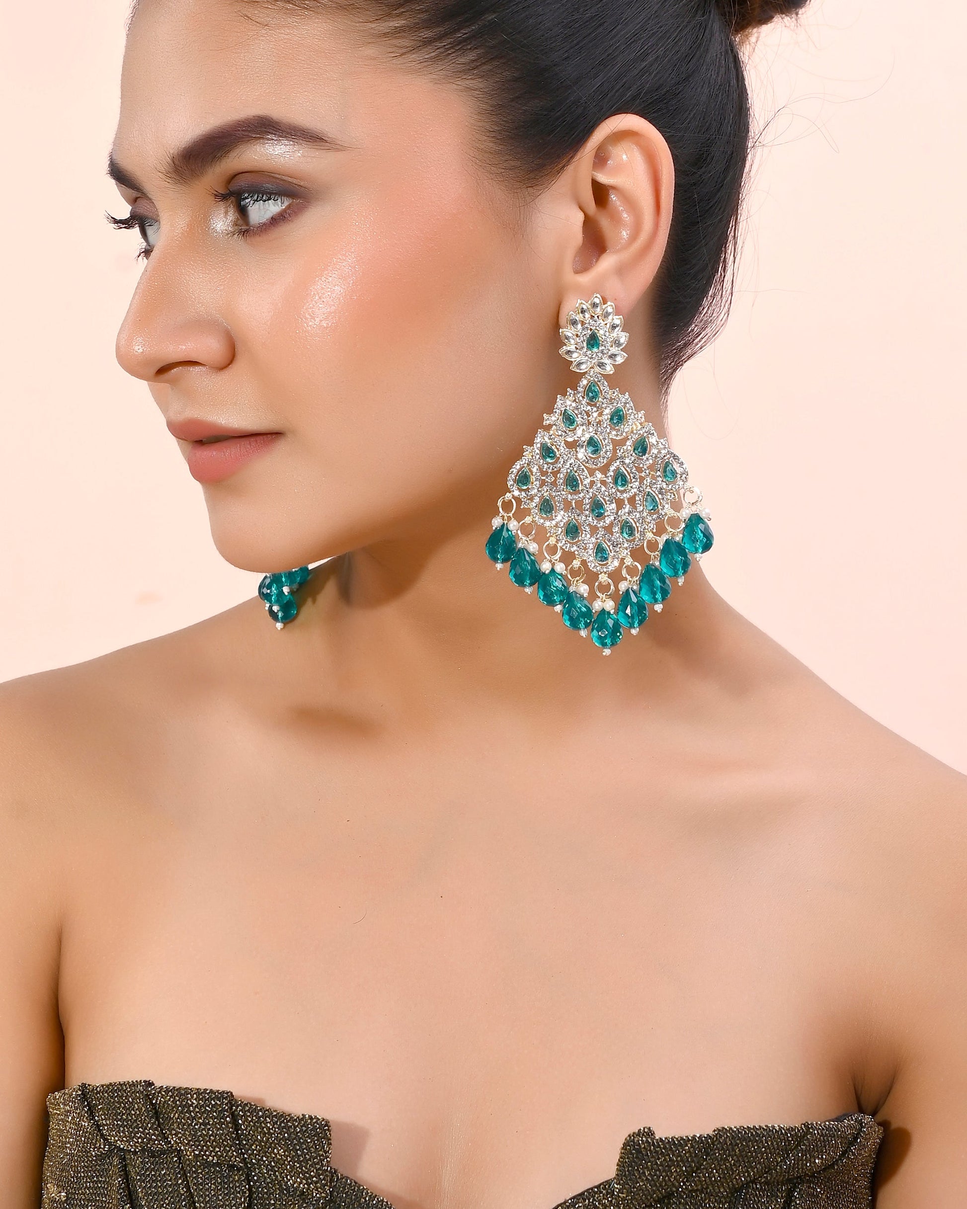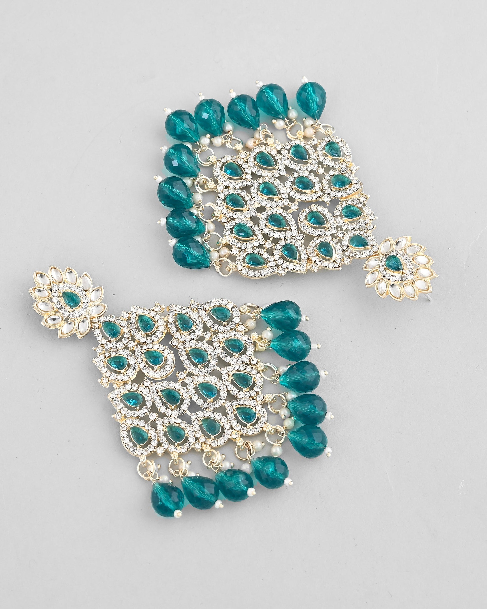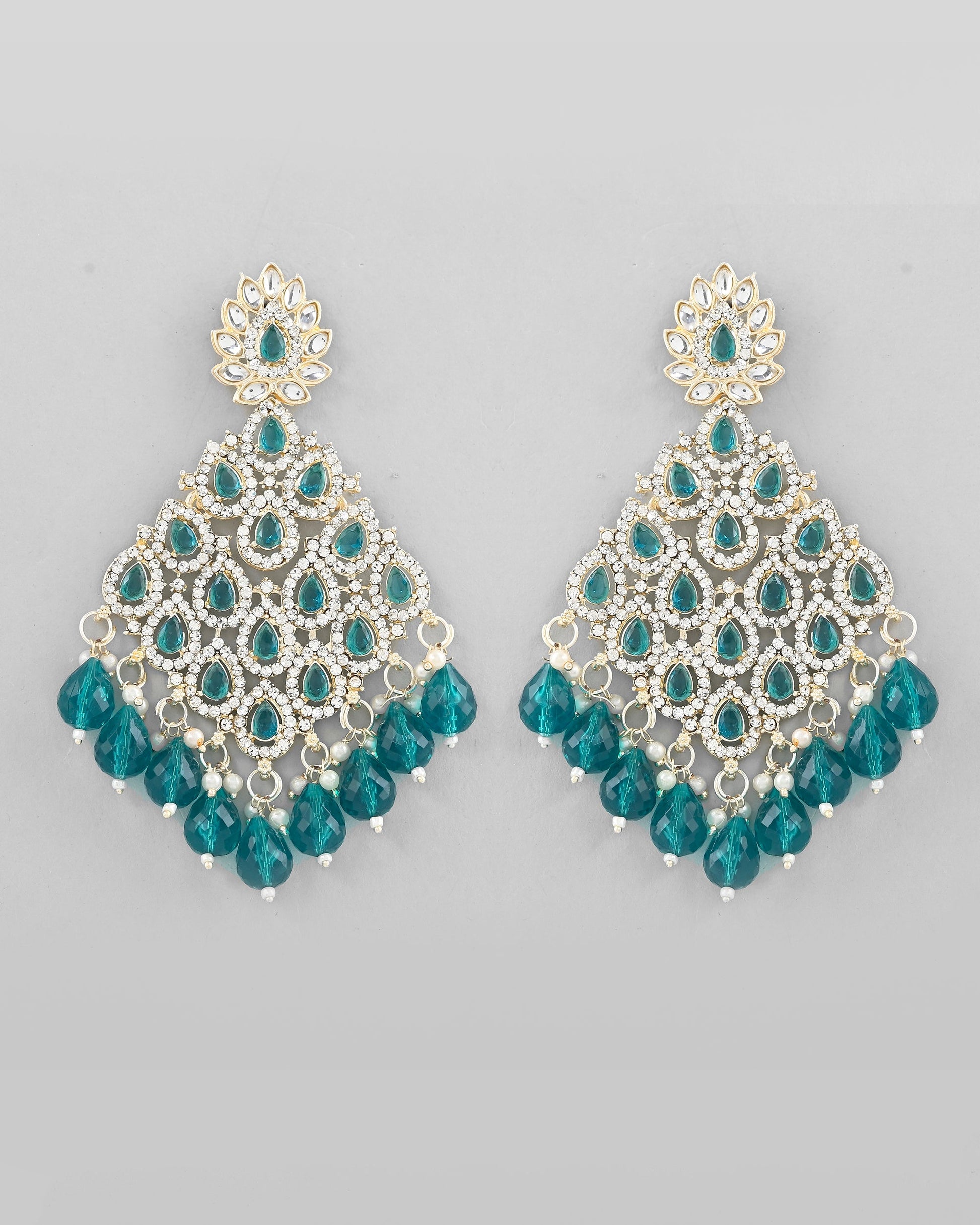 VOJ Traditional Gold-Polished Green & White AD Stone Statement Earrings