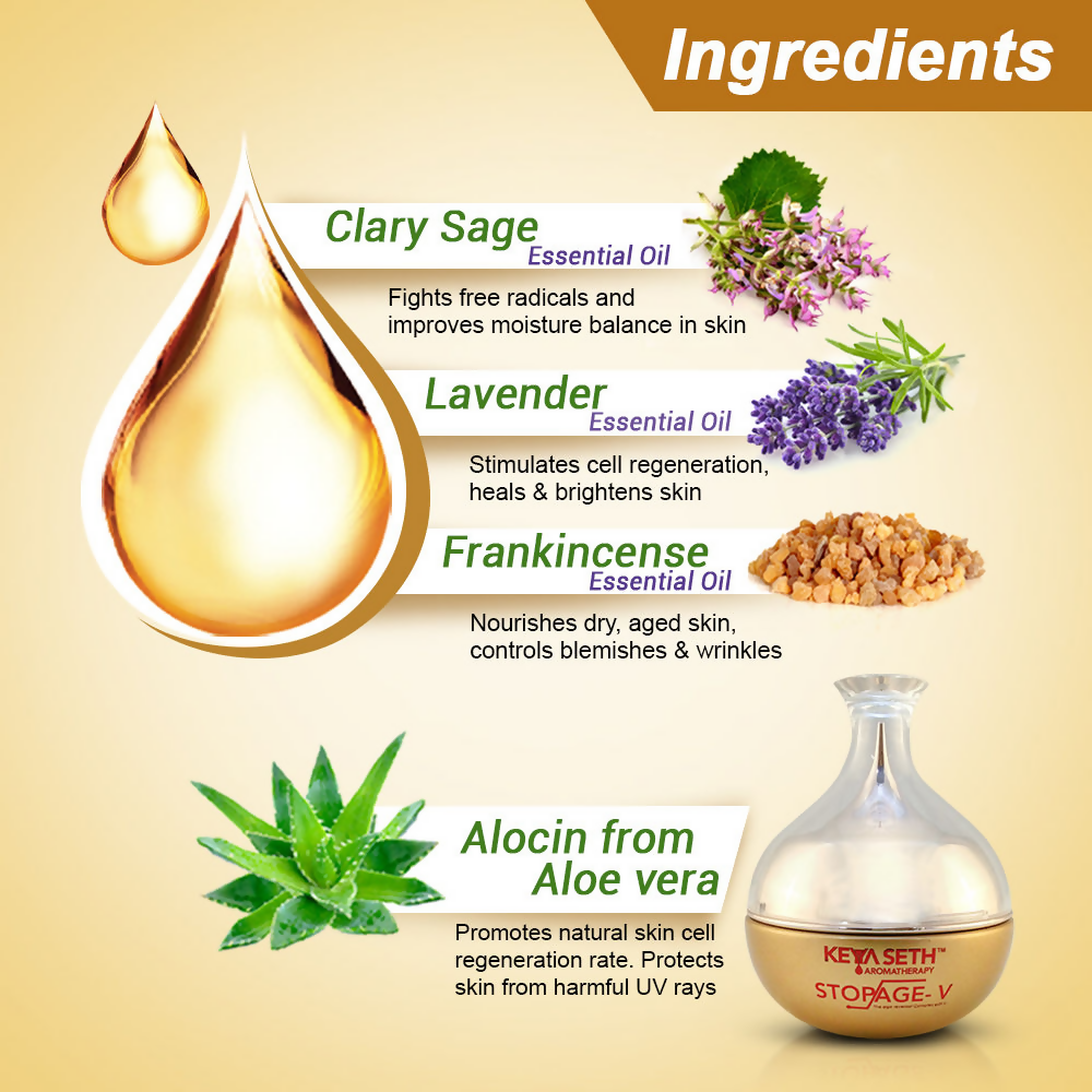 • Keya Seth Aromatherapy, Stopage V - The Age Reversal Complex is an Aromatherapy based, pure essential oil enriched innovative natural formula that helps to keep your skin youthful. This hypoallergenic cream repairs fine lines and wrinkles, erases age spots, rejuvenates skin tone and gives a natural, healthy glow making the skin visibly softer, smoother, brighter and more resilient. Along with the essential oils of Lavender, Clary sage and Frankincense STOPAGE V also contains a potent dose of Vitamin C, Vitamin E, Vitamin B2, B3 (Niacinamide) and B5. Essential peptides, Hyaluronic acid and Aloesin are the other distinct ingredients infused in the formula.
