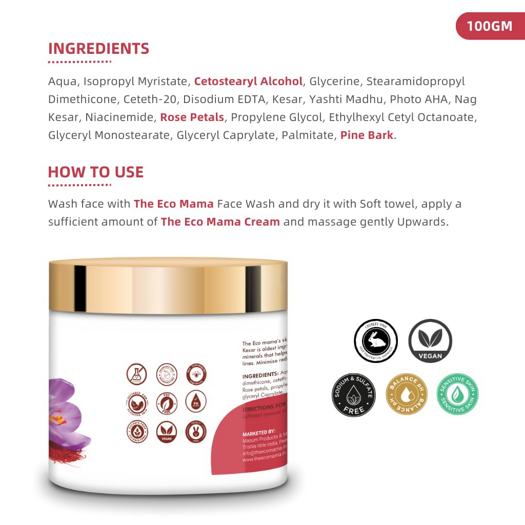 • The Eco Mama skincare range is inspired by nature's best source to provide the best skincare. Kesar is the oldest ingredient to reduce skin pigmentation. It is also rich in antioxidants, vitamins, and minerals that help enhance skin tone. Niacinamide minimizes pore appearance and minimizes fine lines. Minimise redness. Yashtimadhu prevents sun damage and brightens skin's dark scars.
