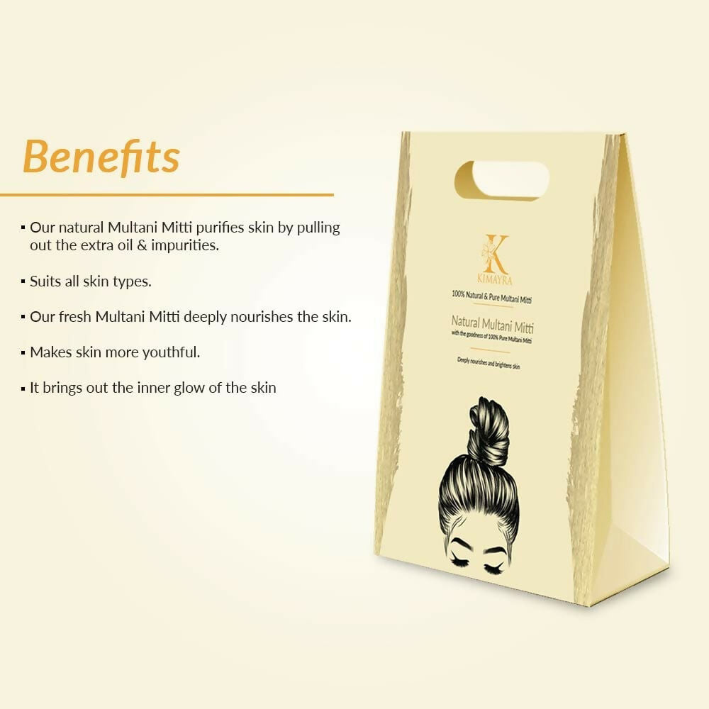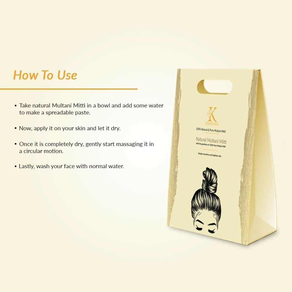• (For Face) take 2 tablespoon of Kimayra World Organic Multani Mitti Powder in a bowl. Add some water or few drops of rose water to make a thick spreadable paste. Keep it for 15-20 minutes. Apply it on the face and neck. Once it is dry, splash some water and gently massage in a circular motion. Wash your face with normal water and pat it dry. Apply moisturizer for deep nourishment.