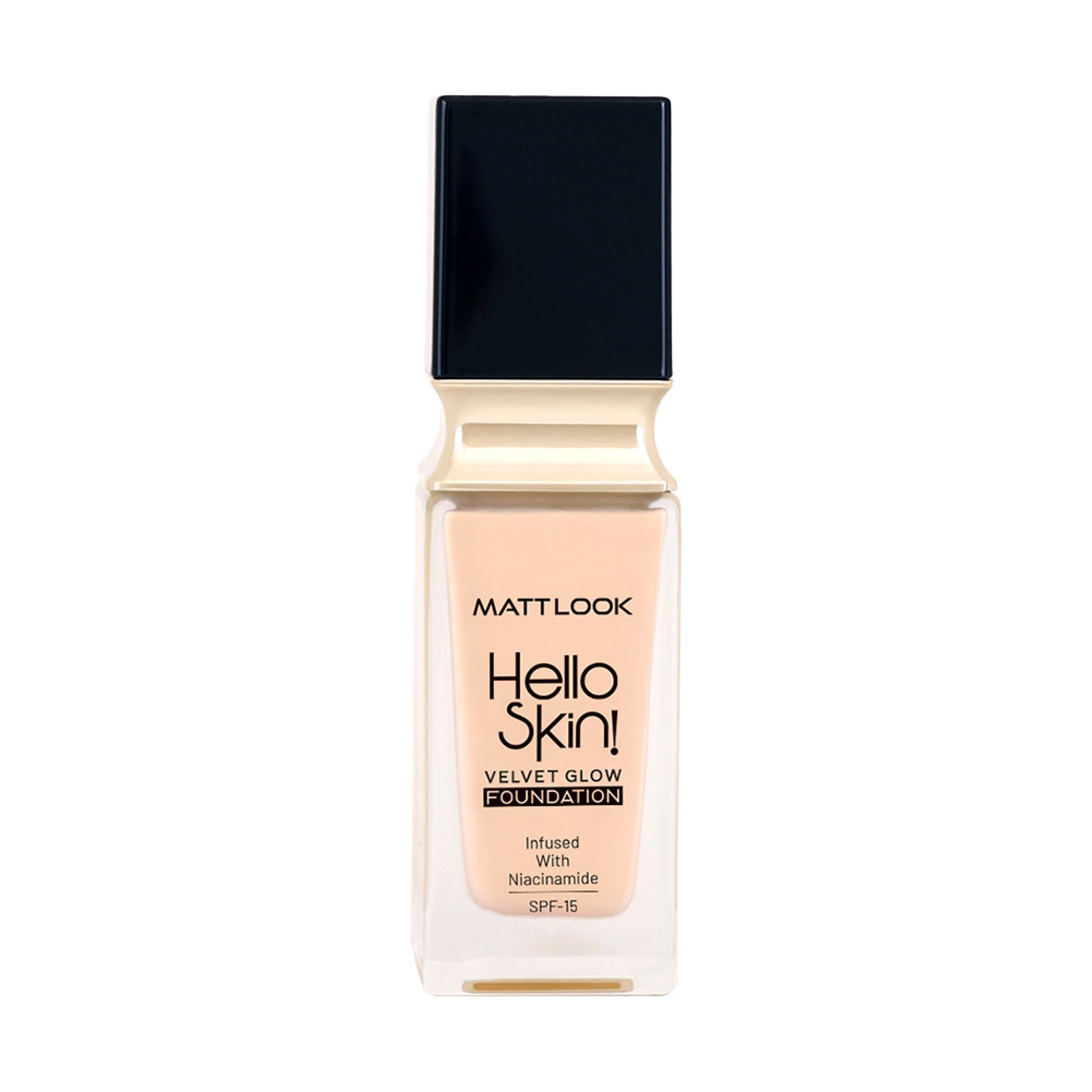 Now say goodbye to dull-looking skin. Matt Look introduces the new Hello Skin Velvet Finish Foundation that helps your skin look even and radiant without creasing. Hello Skin is infused with nourishing niacinamide that hydrates the skin and doesn't cause breakouts. It easily builds from medium to full coverage and gives you a fresh, natural velvet matte finish. This foundation is also transfer-resistant, which means it stays right where you want it for the next 24 hours.