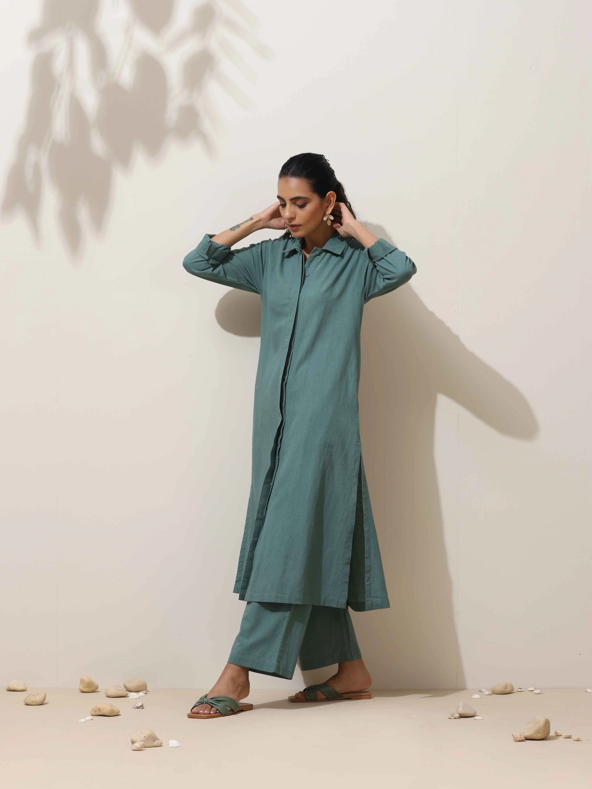 • Elevate your style with this green front-button kurta, paired with green pants. It's an ideal blend of elegance and comfort, perfect for both casual and semi-formal occasions.