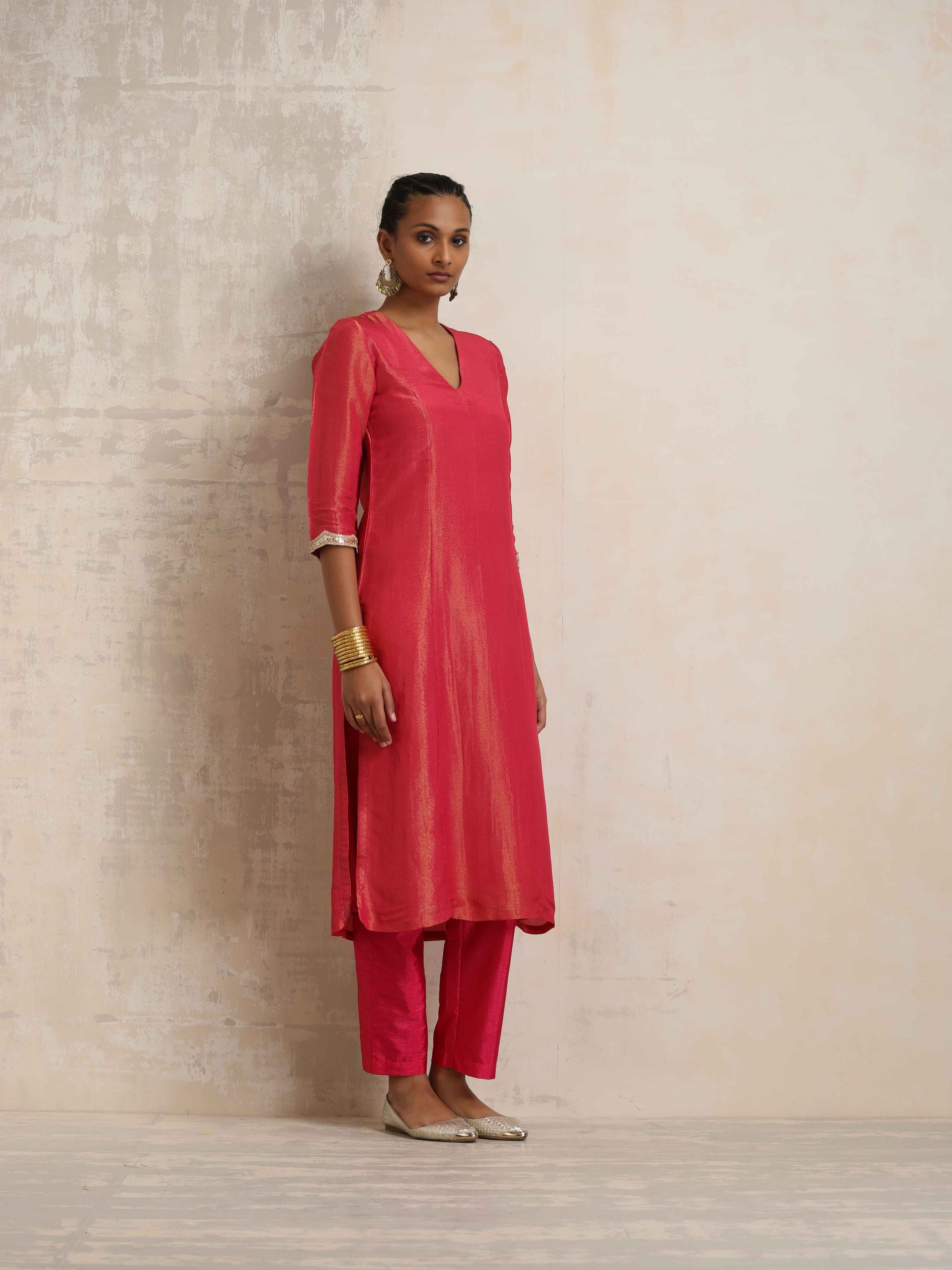trueBrowns Hot Pink Tissue Straight Kurta Set
