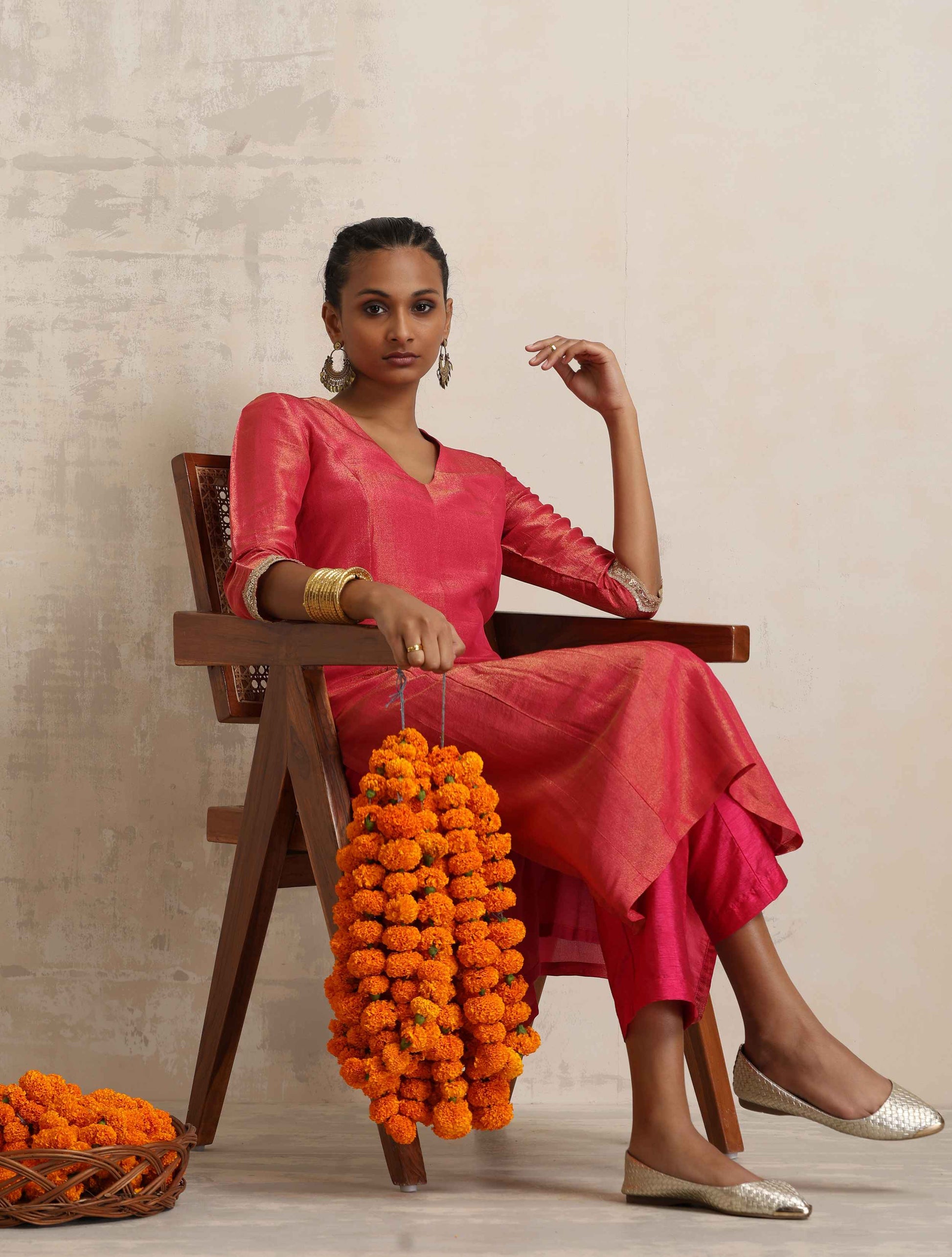 trueBrowns Hot Pink Tissue Straight Kurta Set