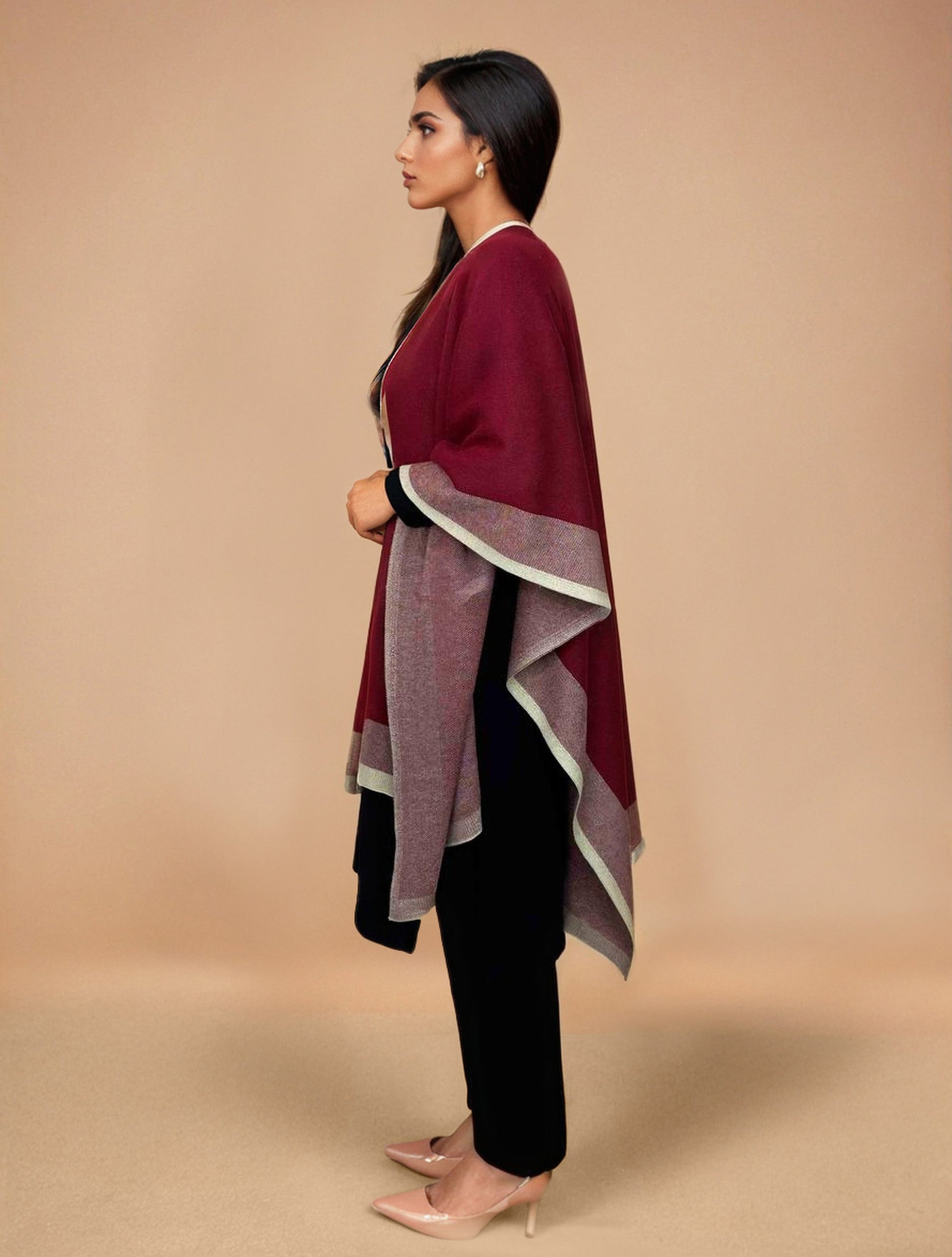 • Elevate your style with this maroon woollen kaftan cape, it's an ideal blend of elegance and comfort.