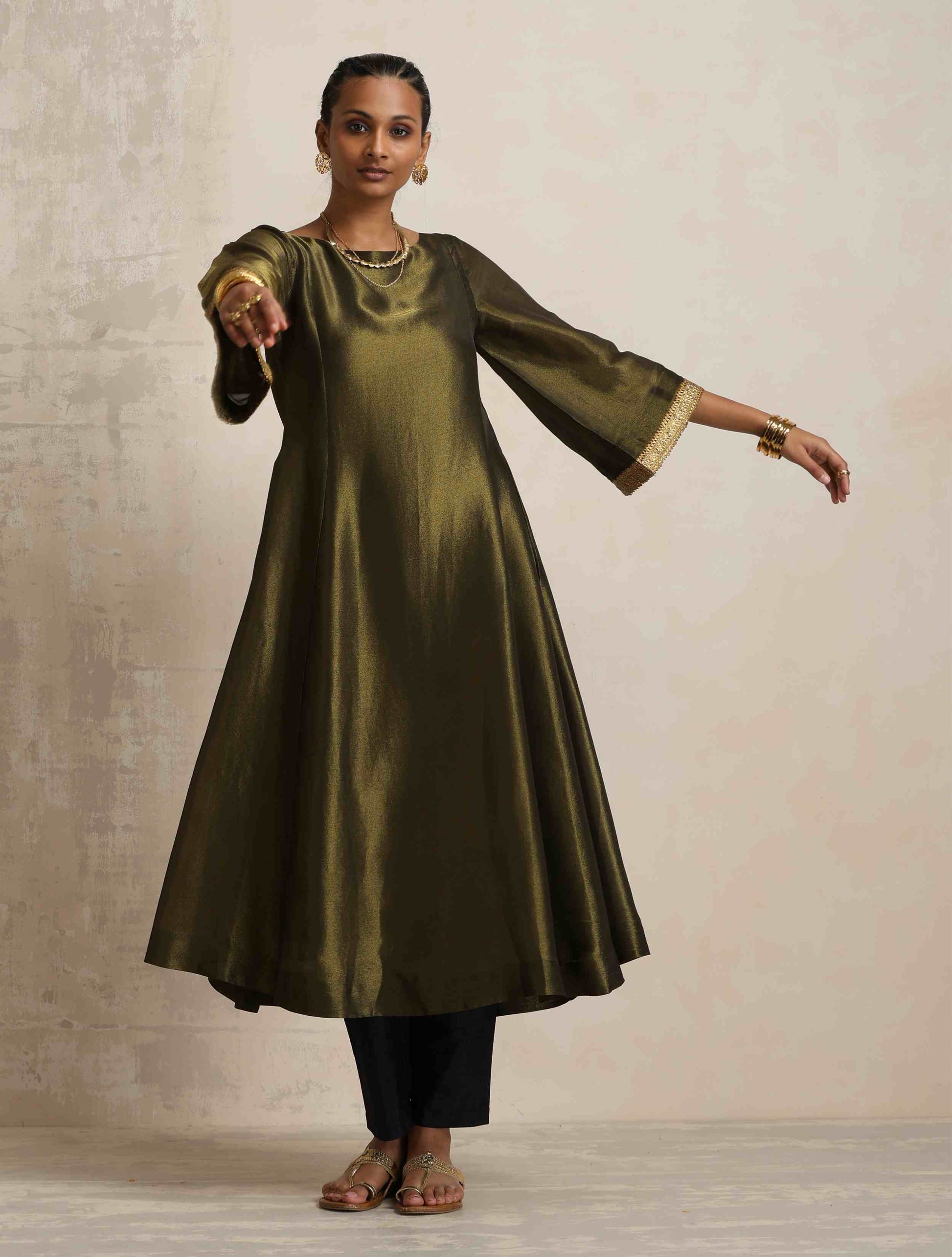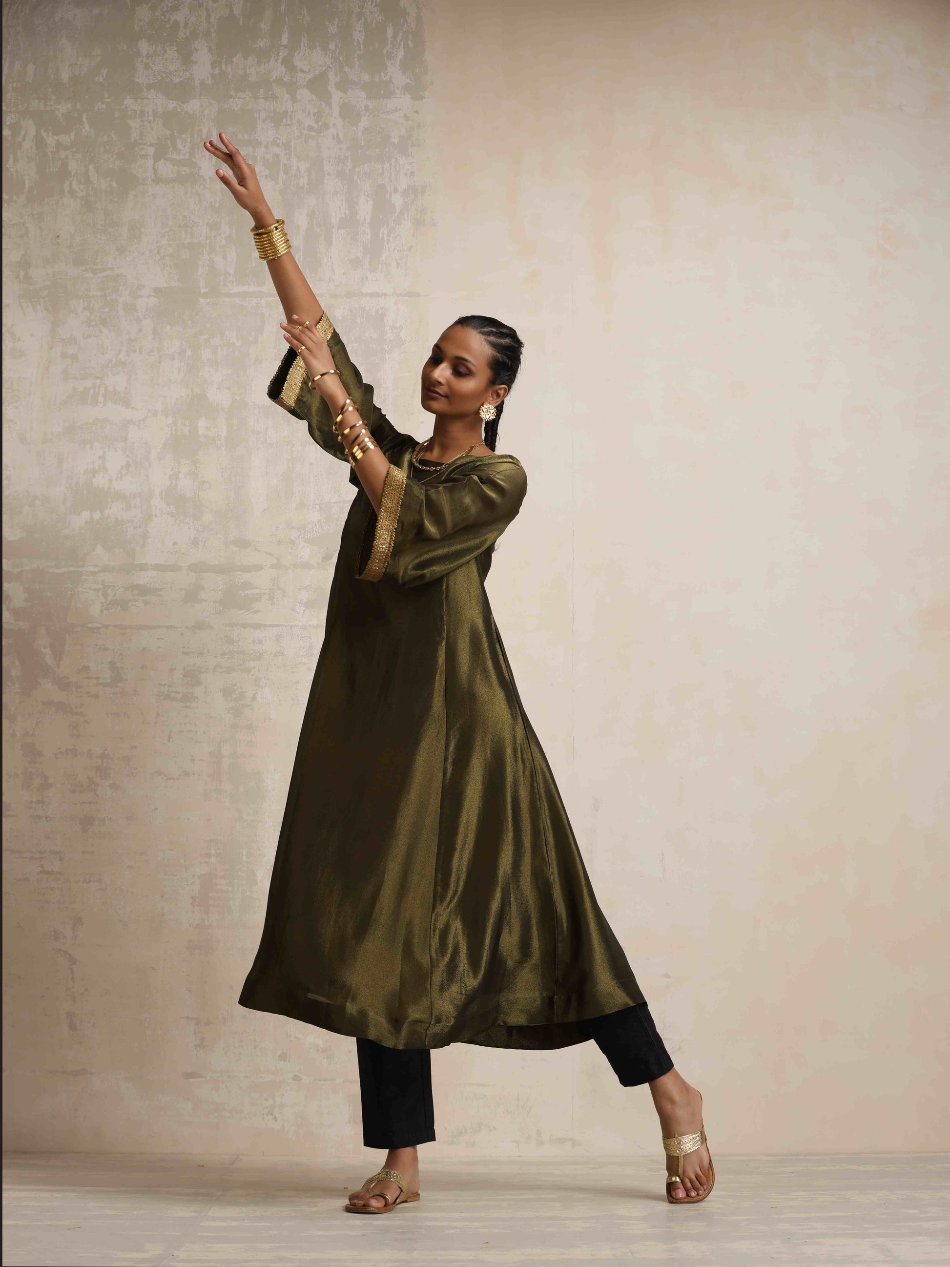 trueBrowns Olive Green Tissue Flared Anarkali Kurta Set