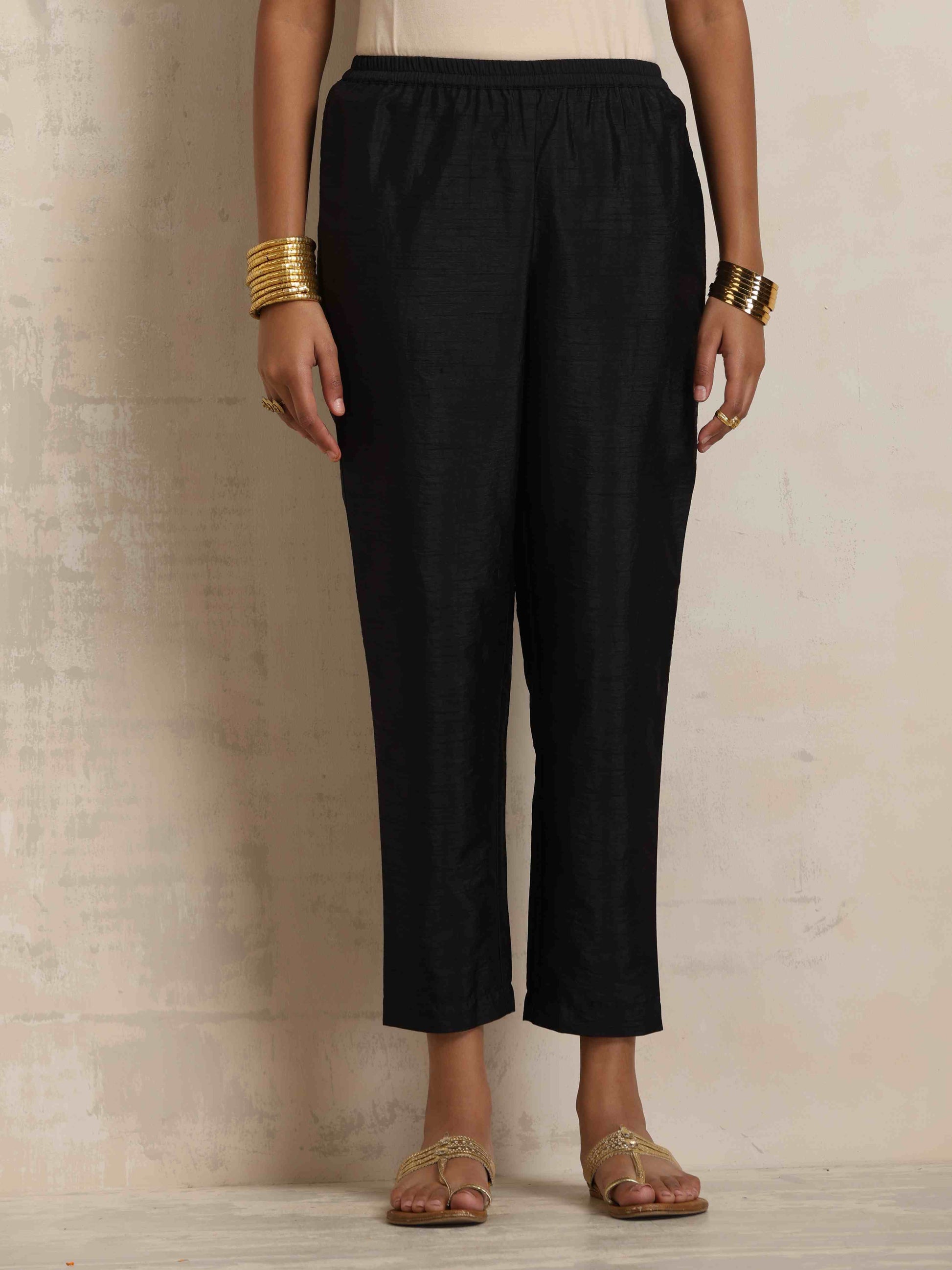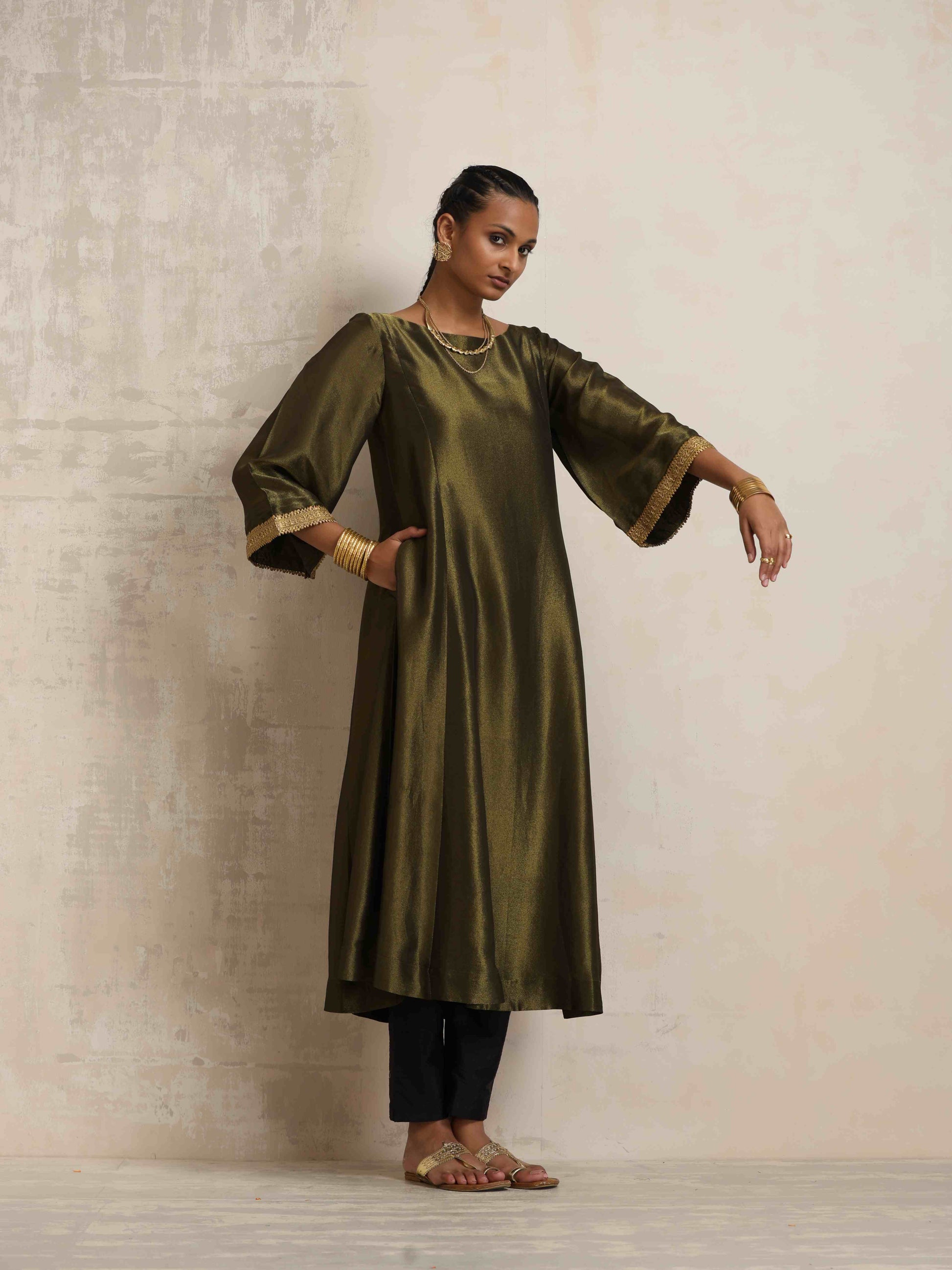 • Elevate your style with this olive green tissue flared anarkali kurta paired perfectly with black silk blend elasticated waist pants