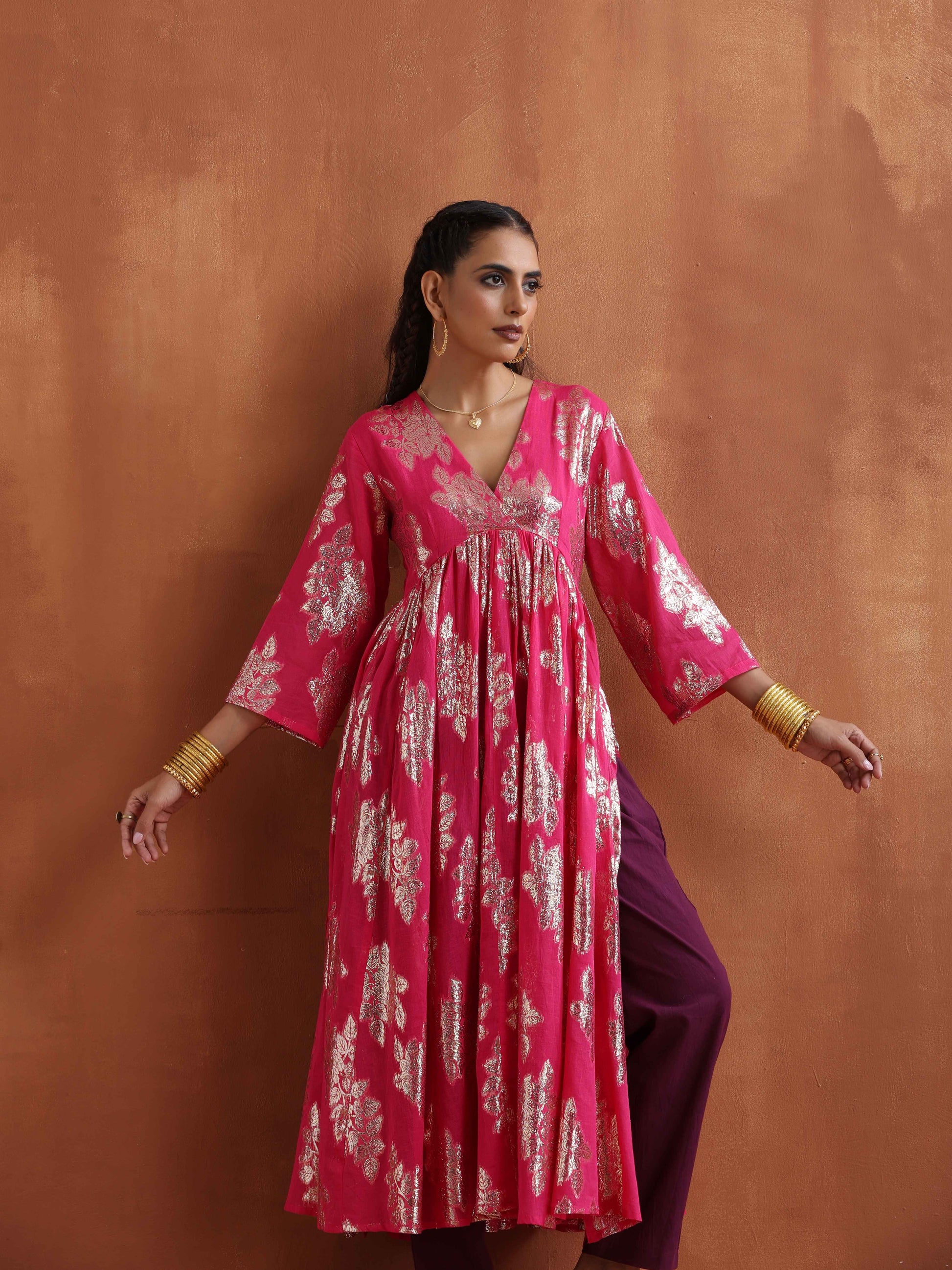 trueBrowns Pink Metallic Flared Anarkali Kurta Set