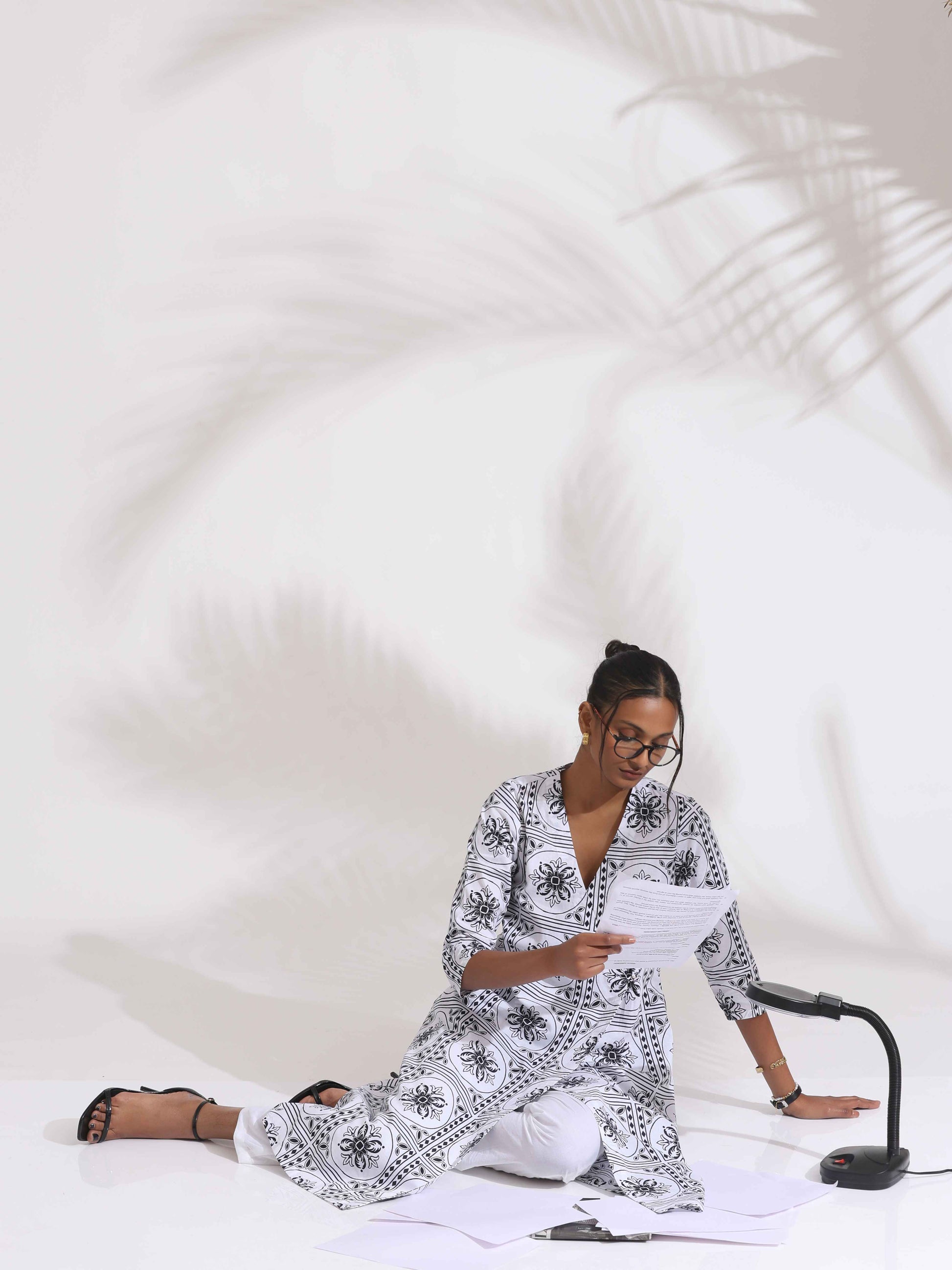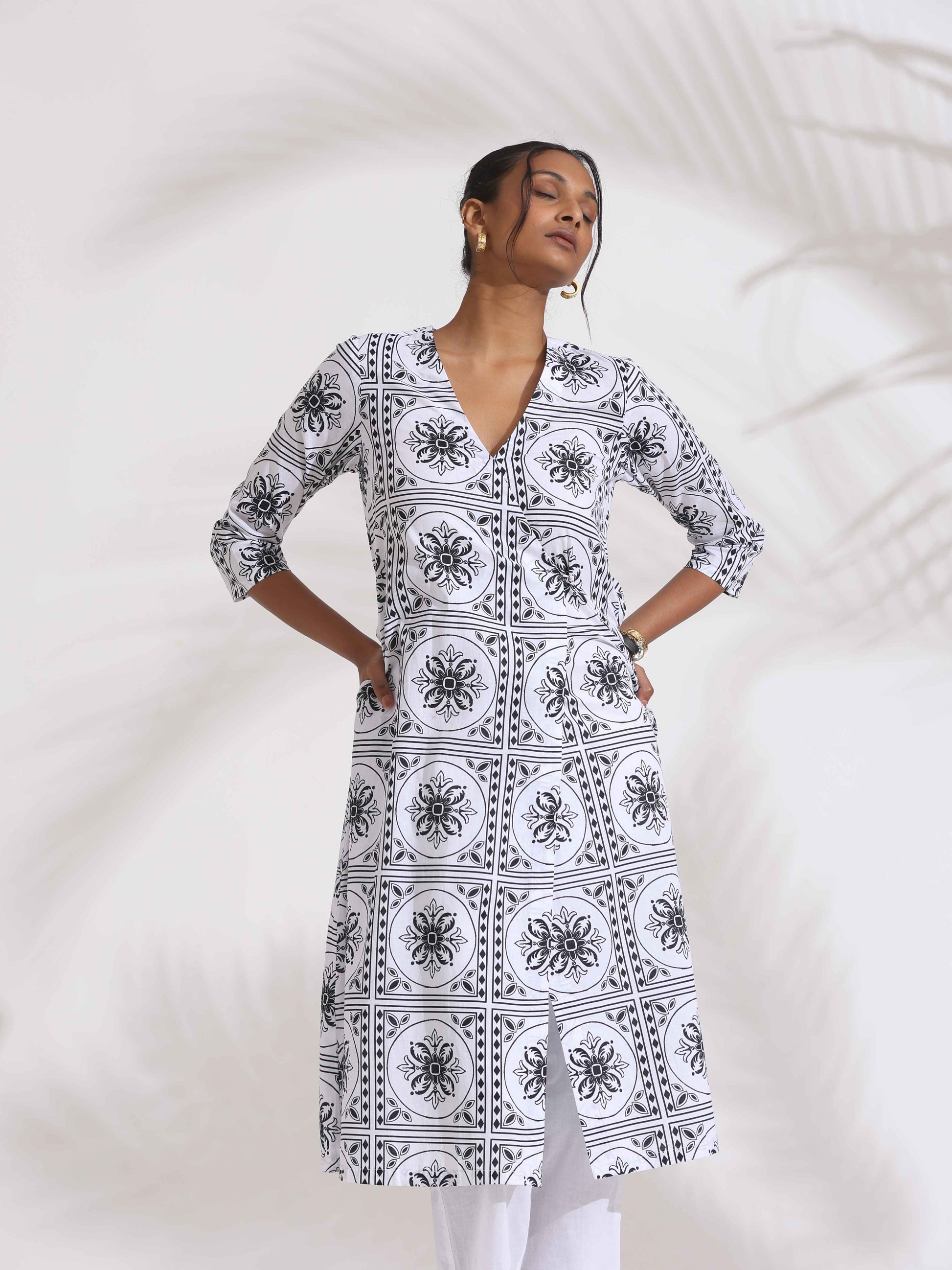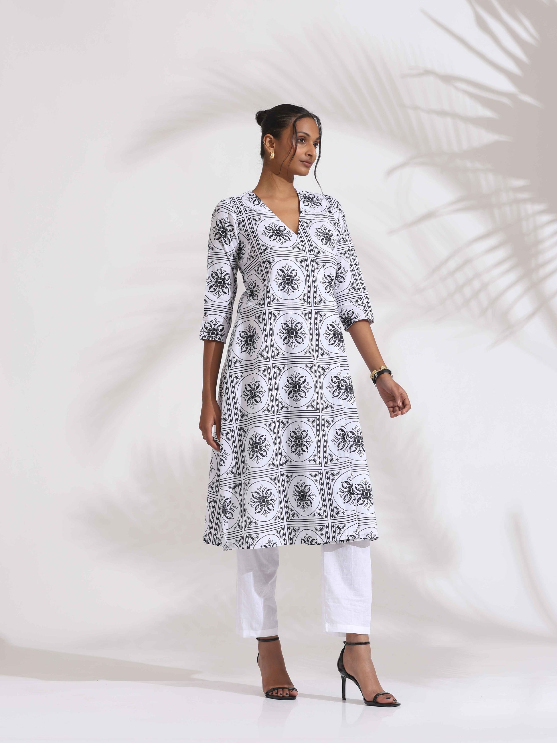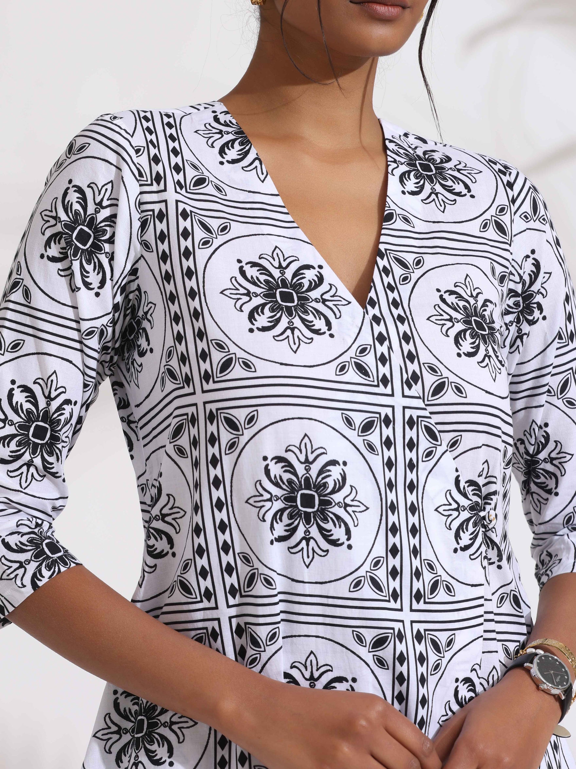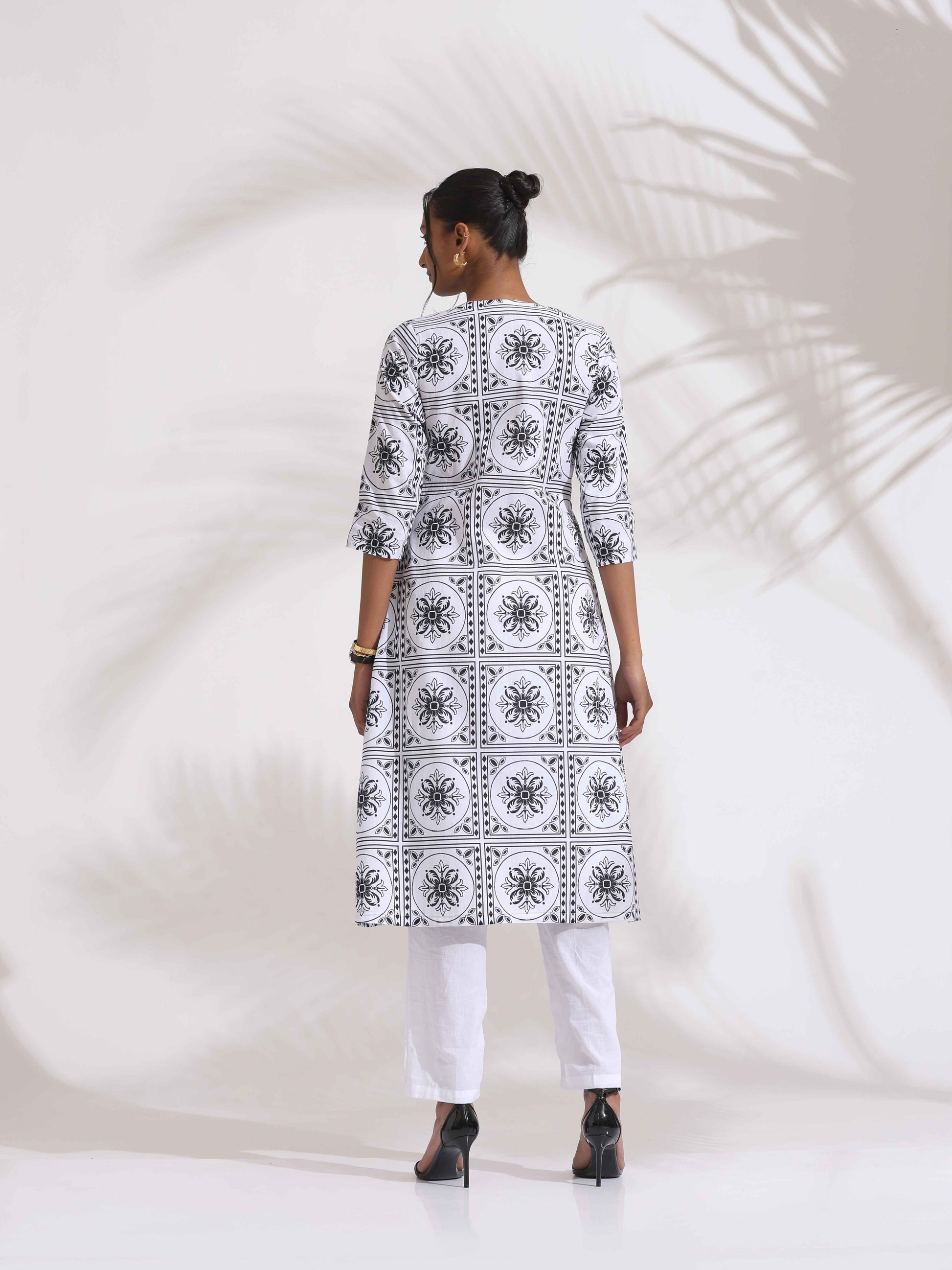 trueBrowns White Cotton Geometric Print Angrakha Kurta Set