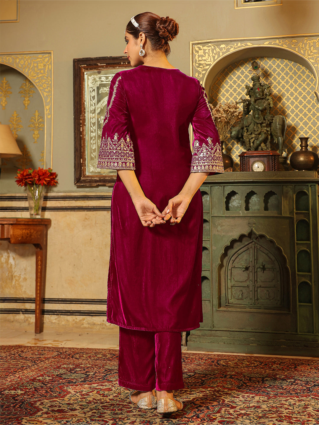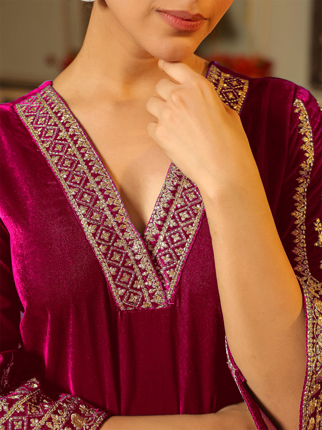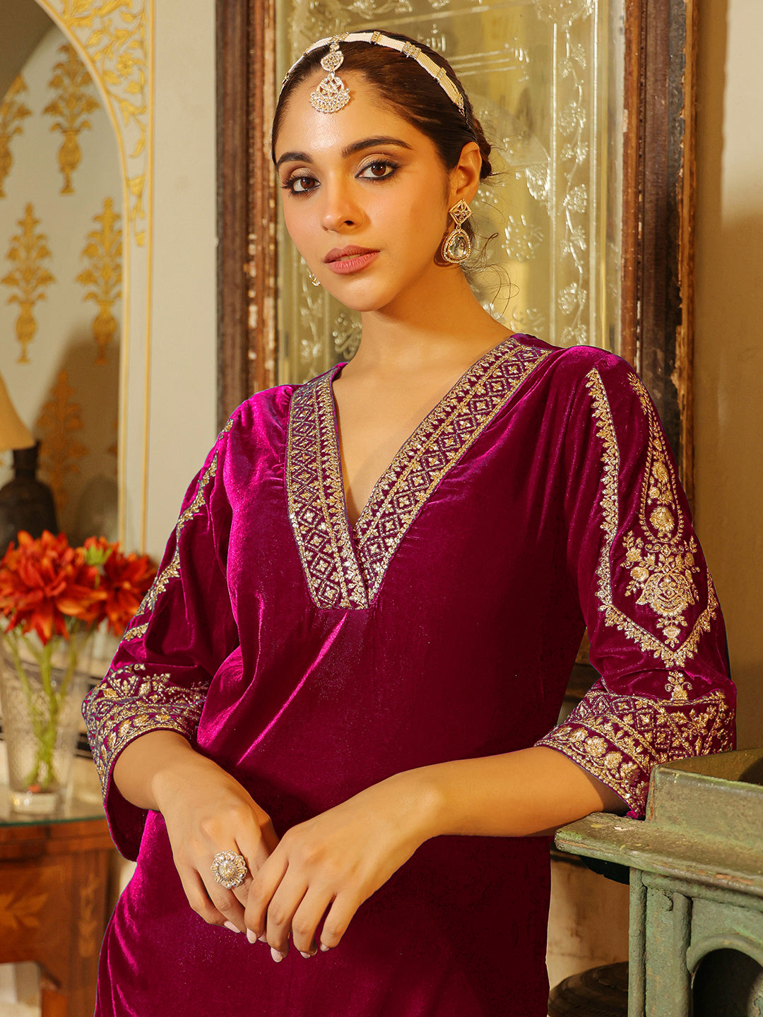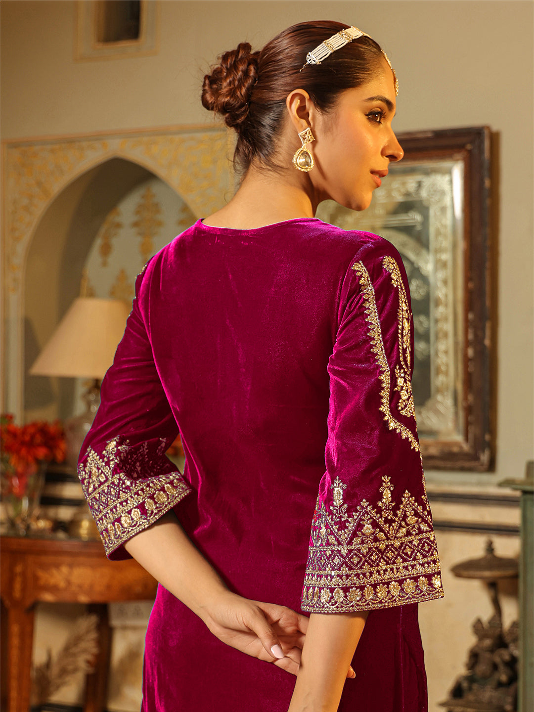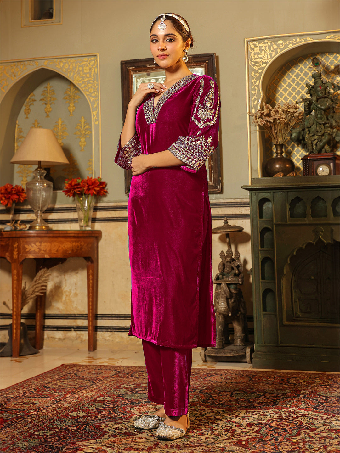 Janasya Pink Velvet Embroidered Kurta & Bottom