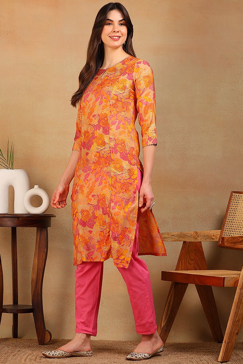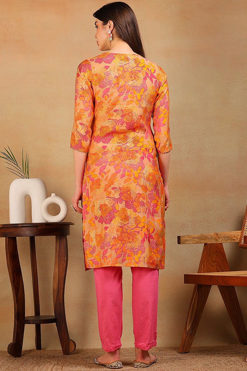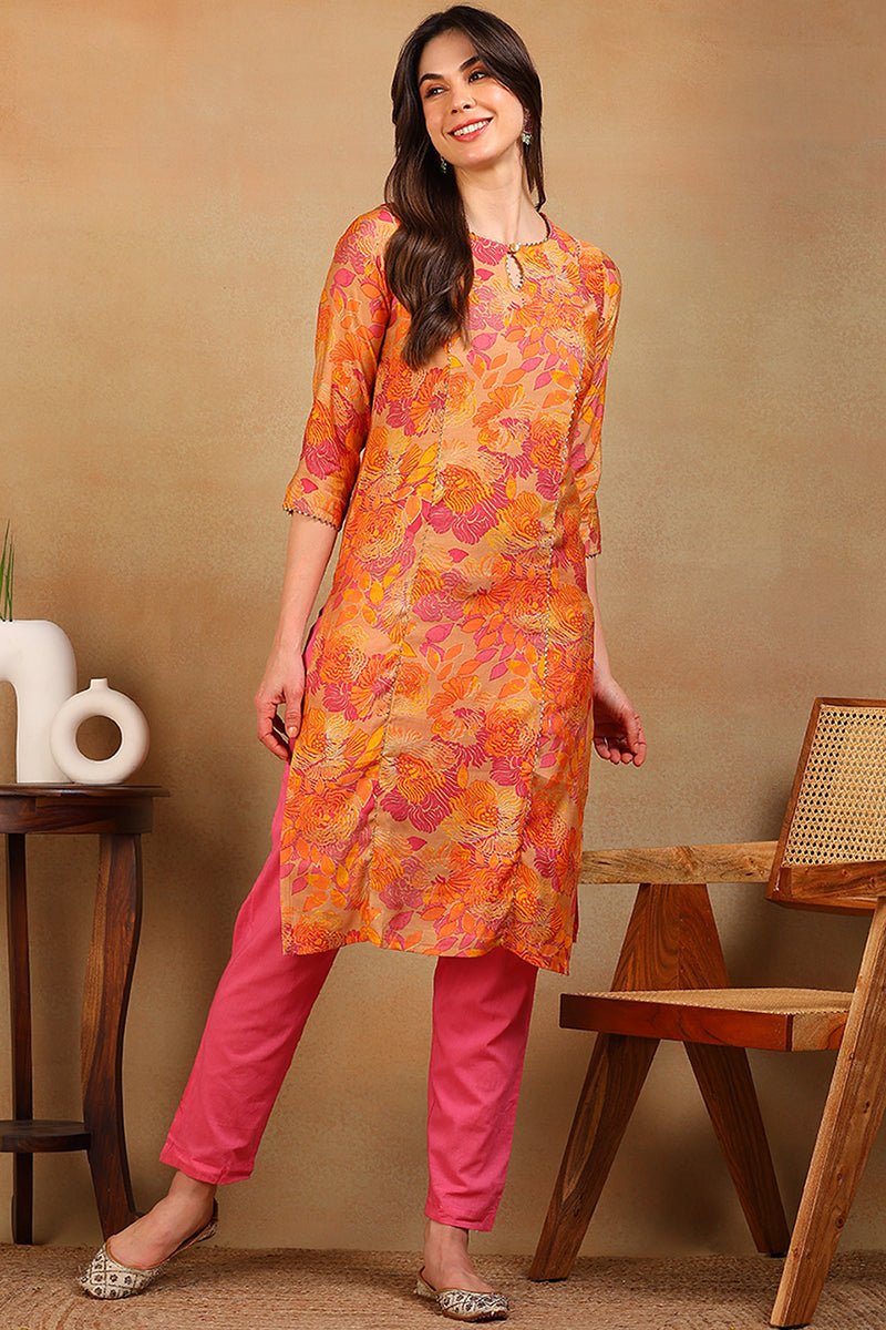 Ahika Beige & Orange Poly Silk Straight Kurta