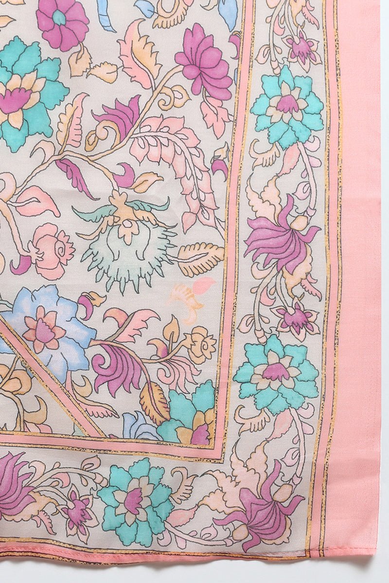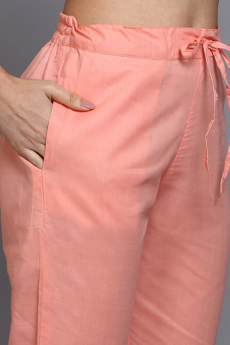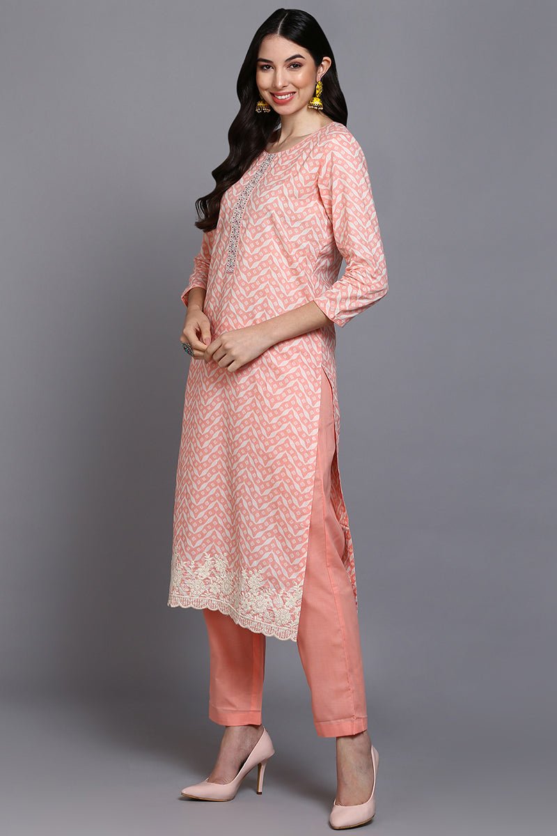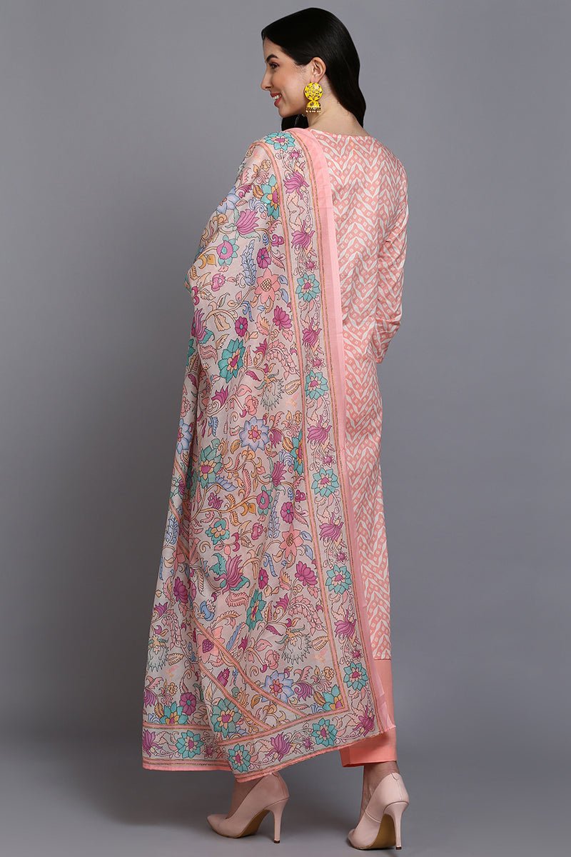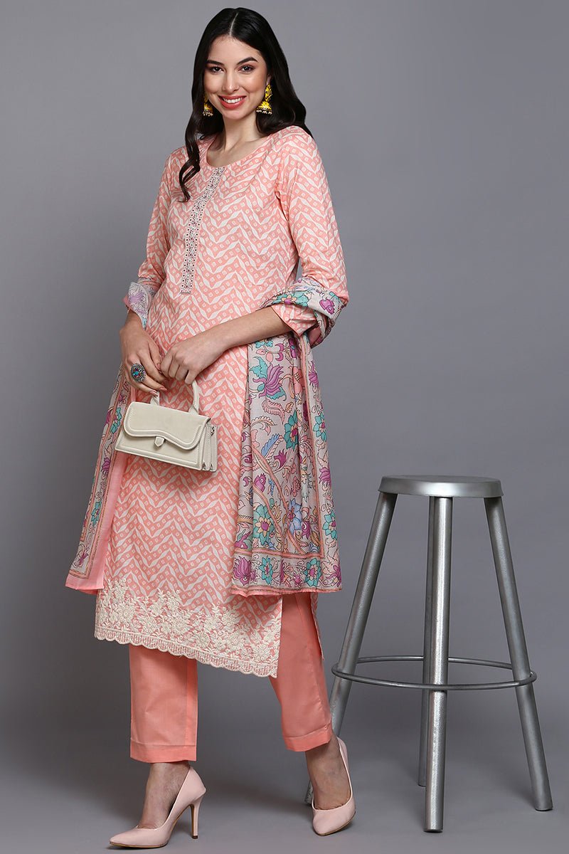 Ahika Cotton Peach Printed Straight Kurta Pant With Dupatta