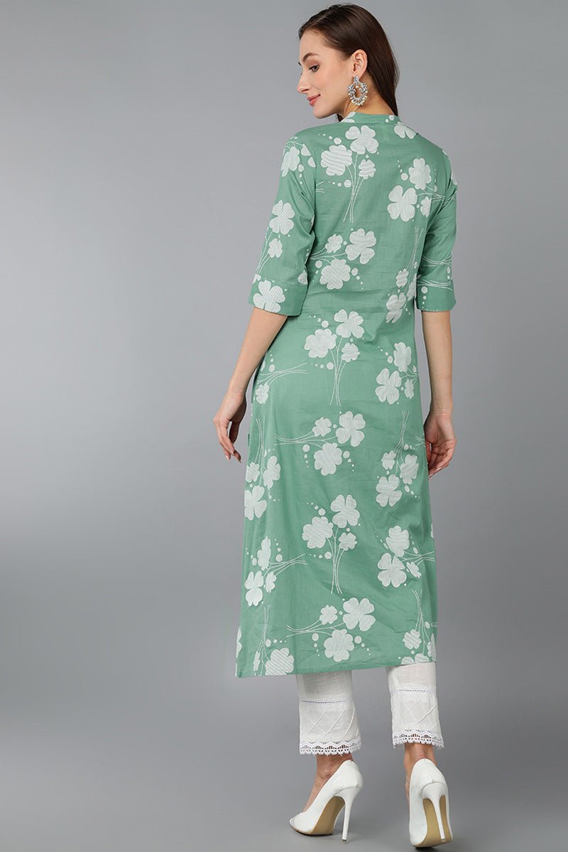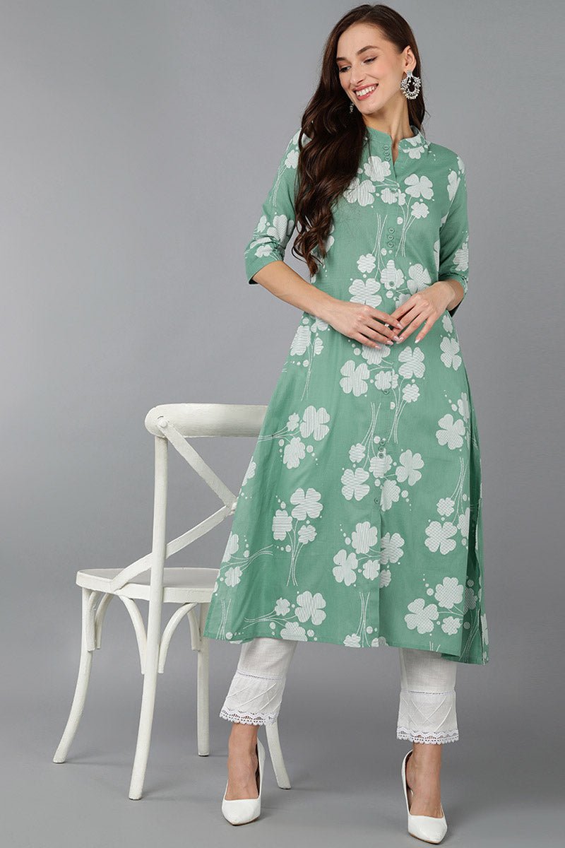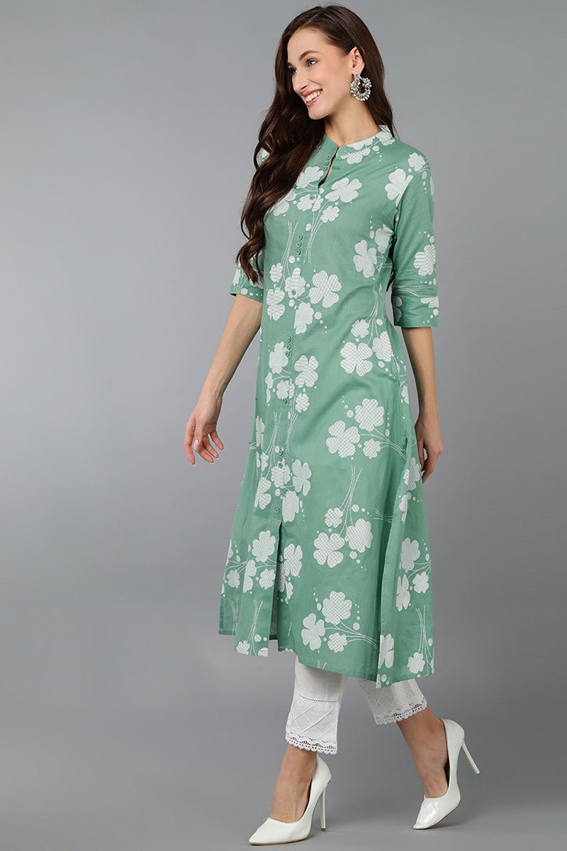 Ahika Green Cotton Floral Printed A-Line Kurta