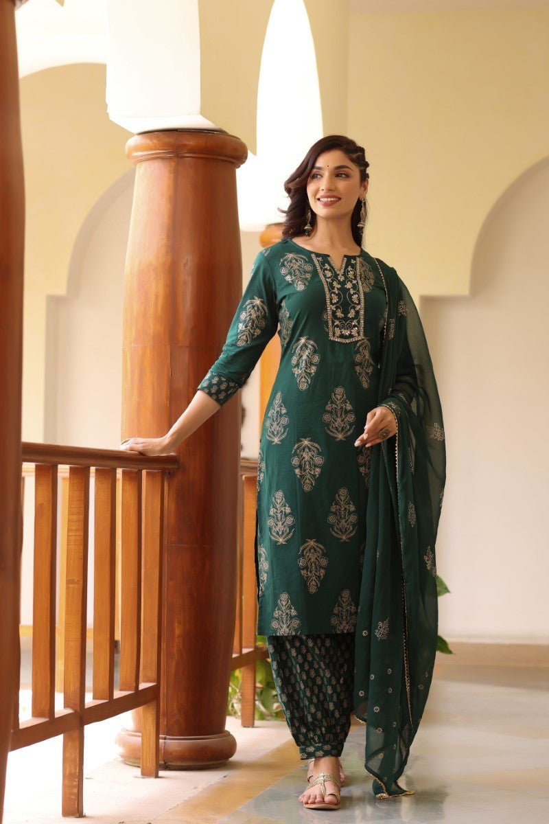 Ahika Green Gold Ethnic Print sequence Detail Cotton Kurta with Trousers Dupatta