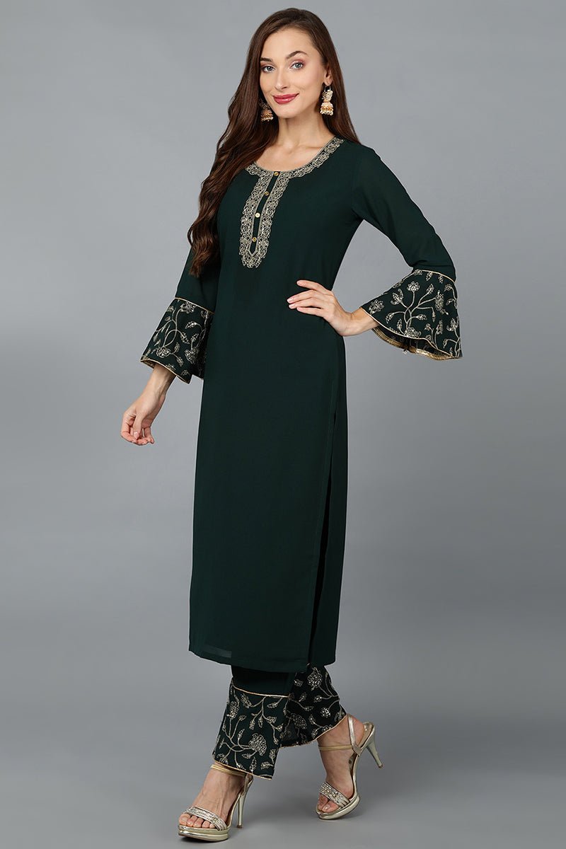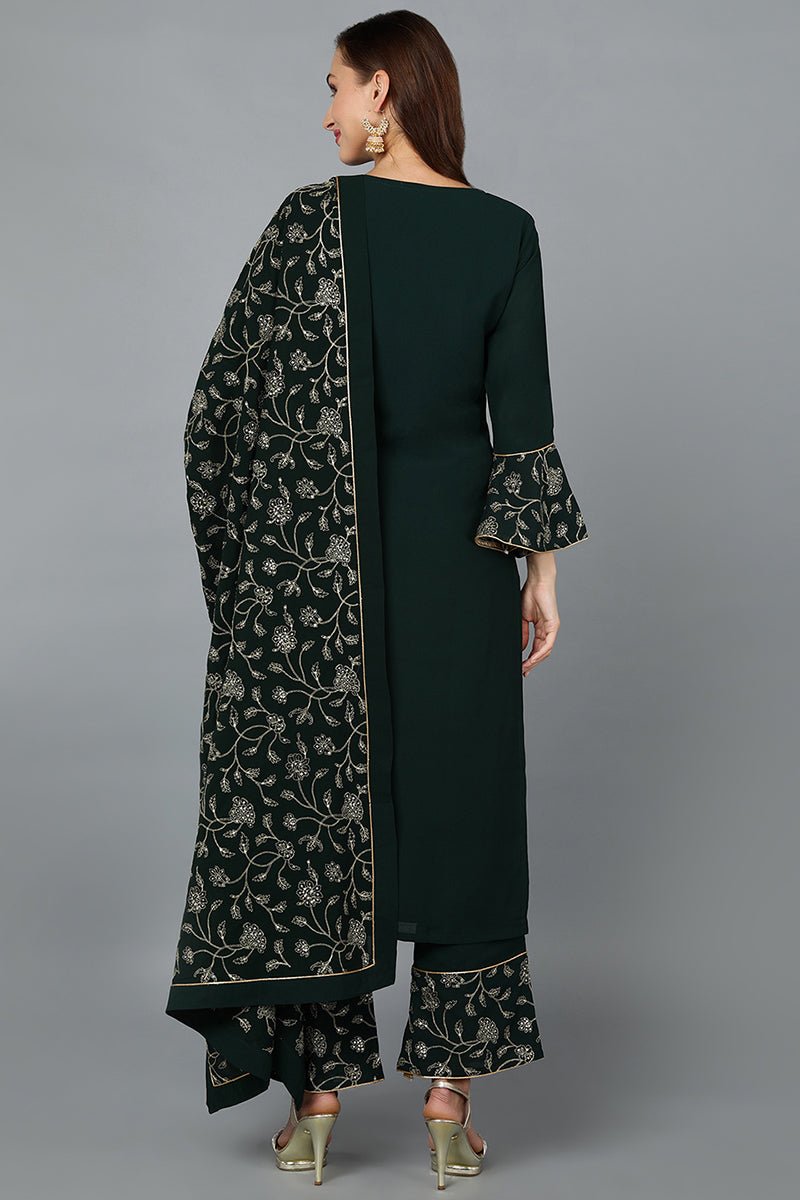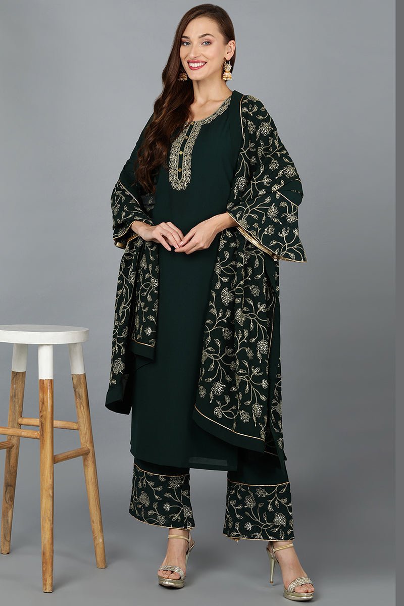 Ahika Green Poly Georgette Straight Kurta Palazzo With Dupatta