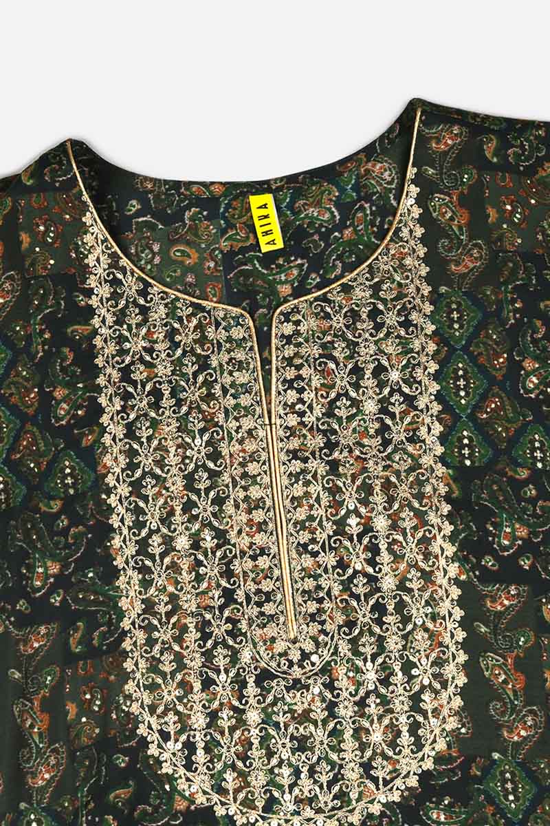 Ahika Green Silk Blend Abstract Yoke Design Straight Kurta