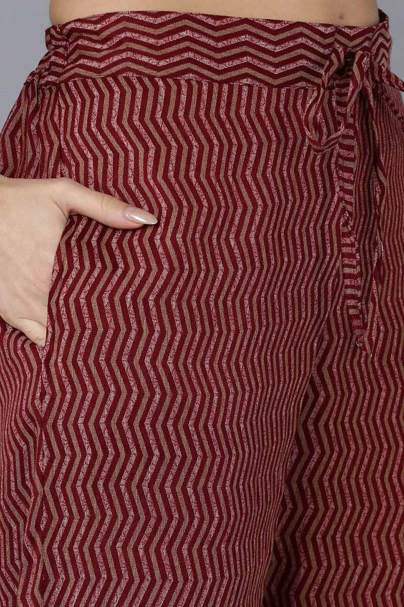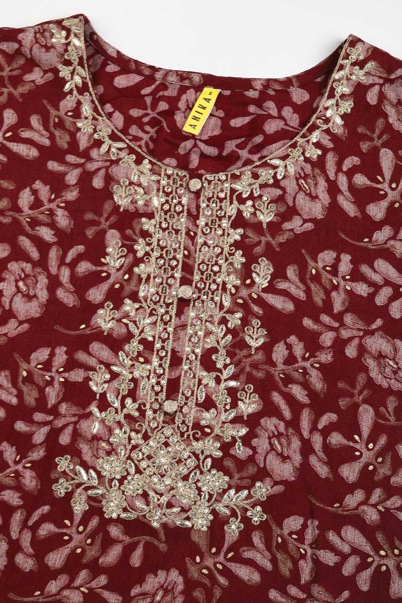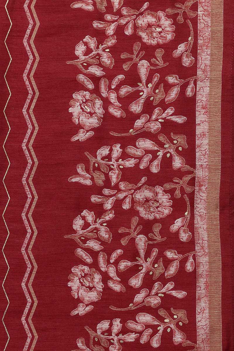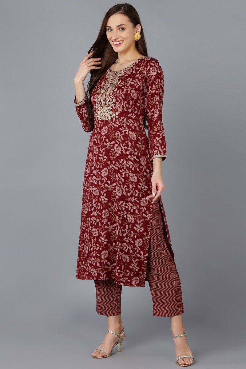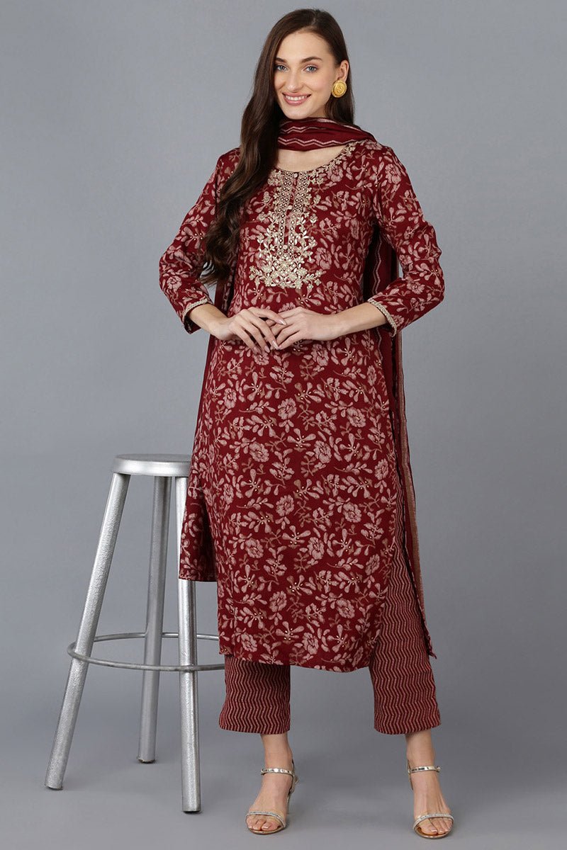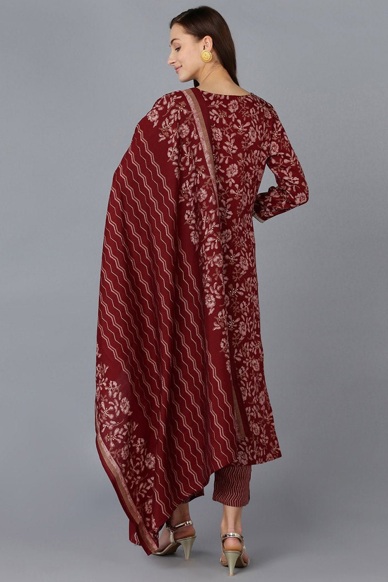 Ahika Maroon Silk Blend Floral Straight Kurta Trousers With Dupatta