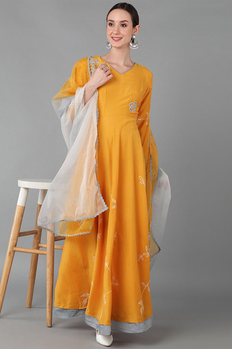 Ahika Mustard Silk Blend Flared Kurta With Dupatta