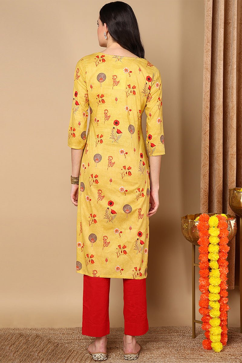 Ahika Mustard Yellow & Red Floral Print Straight Kurta