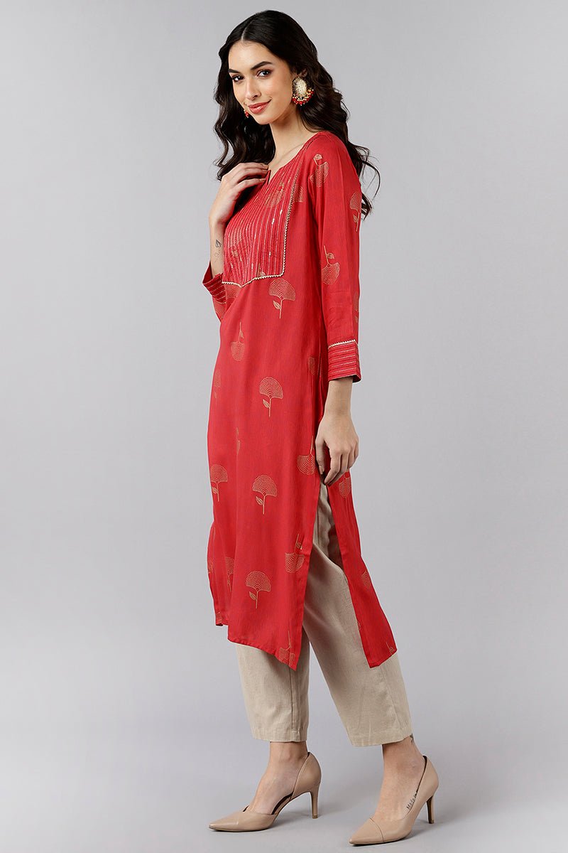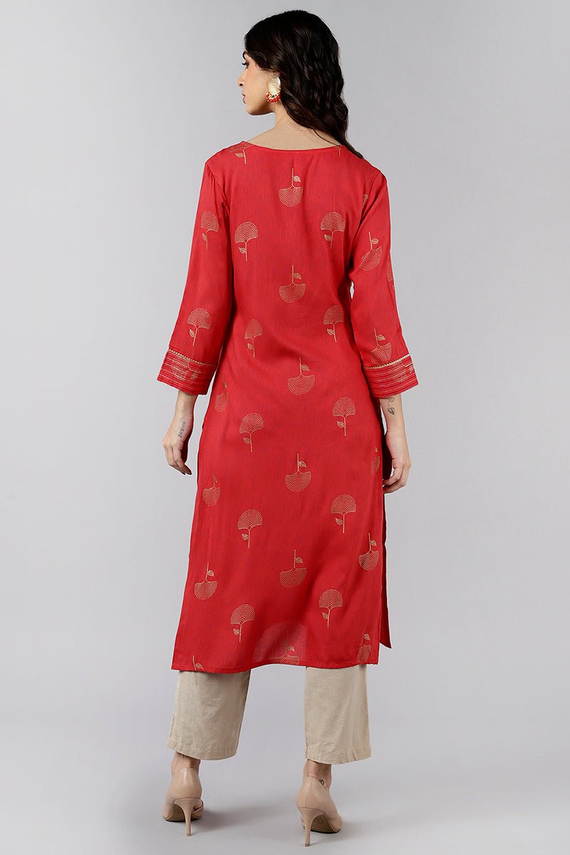 Ahika Red Cotton Sequin Embroidered Straight Kurti