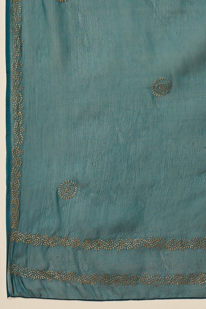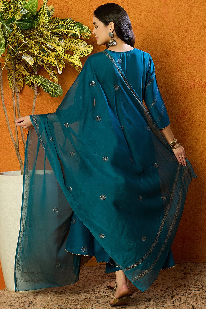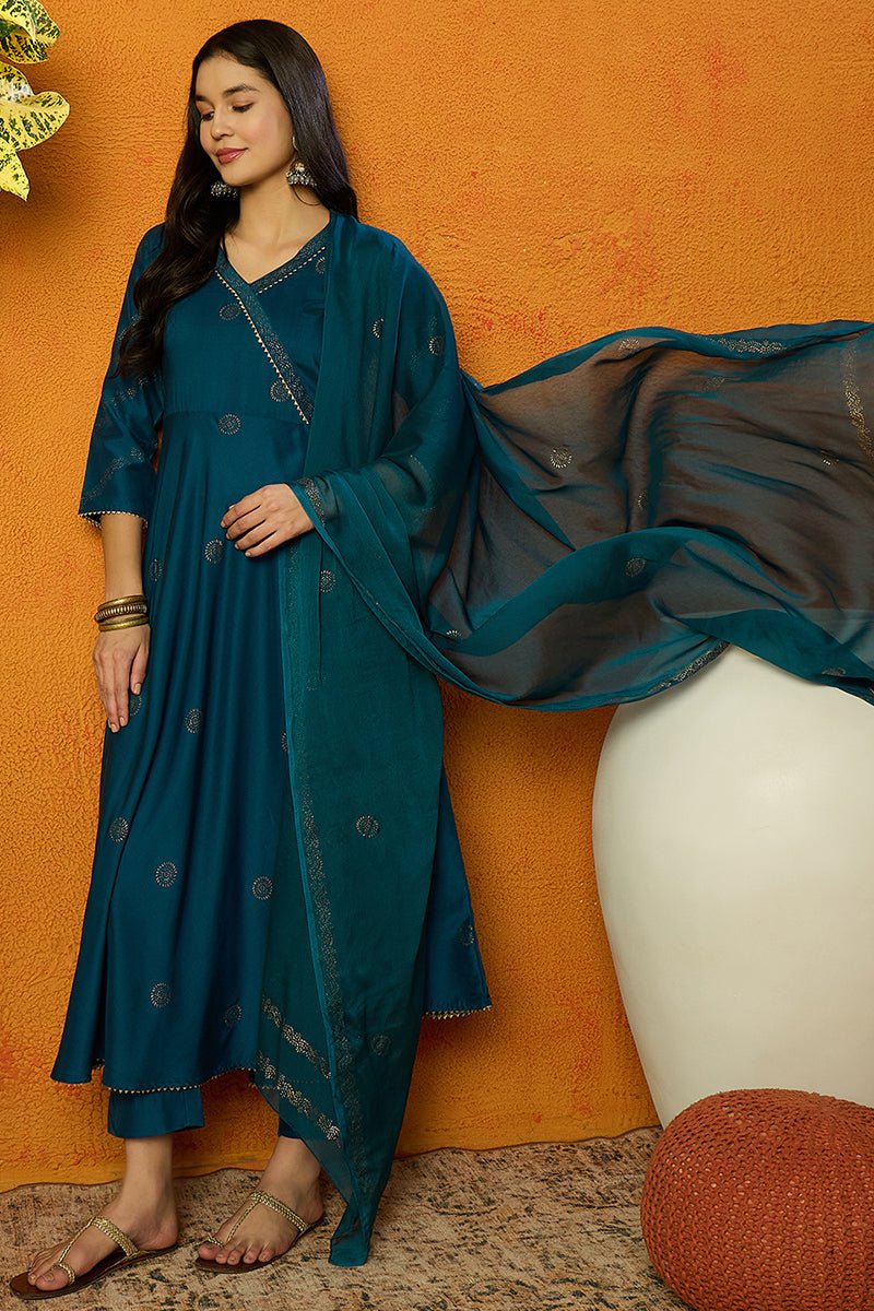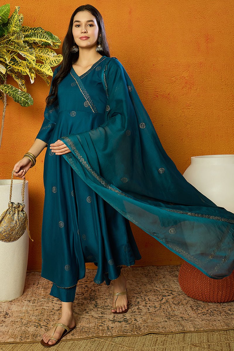 Ahika Teal Silk Blend Anarkali Woven Design Kurta Pant With Dupatta