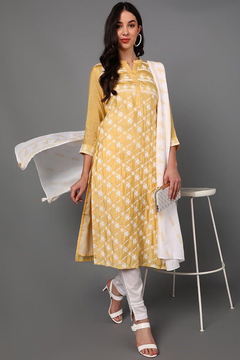 Ahika Yellow Poly Silk Ethnic Motifs Straight Suit Set