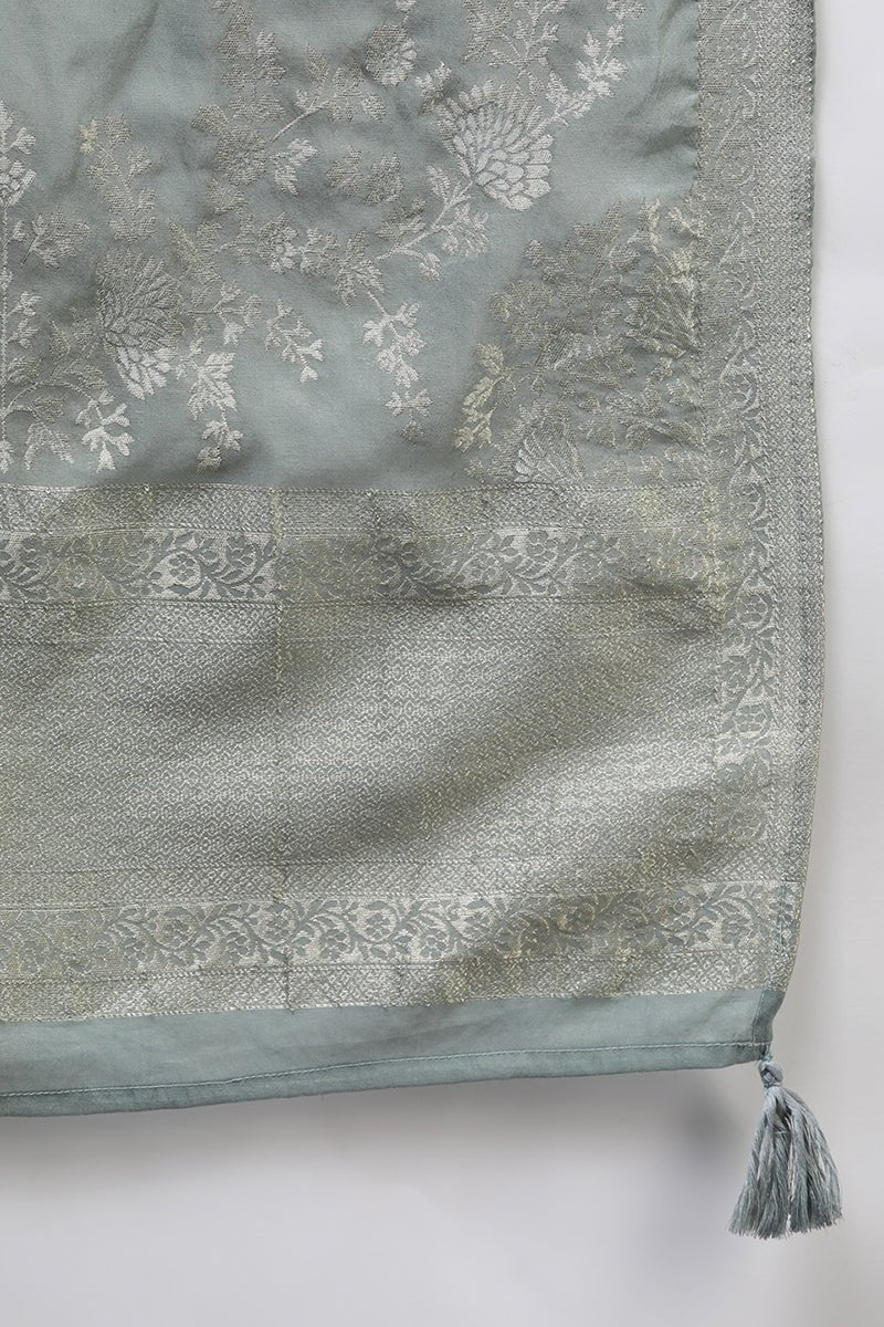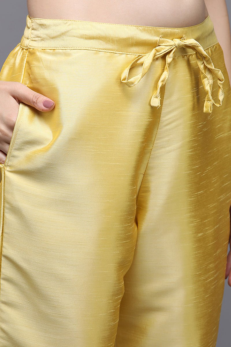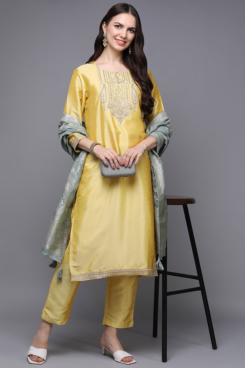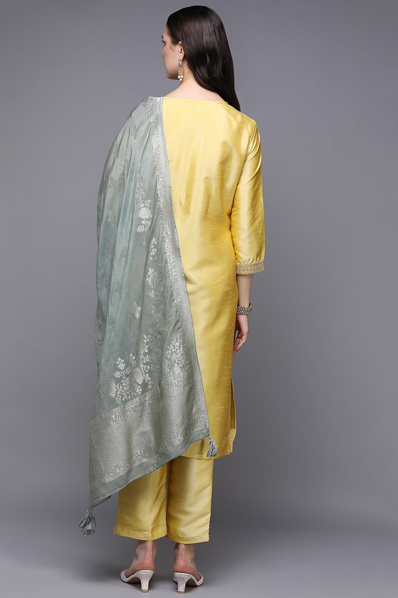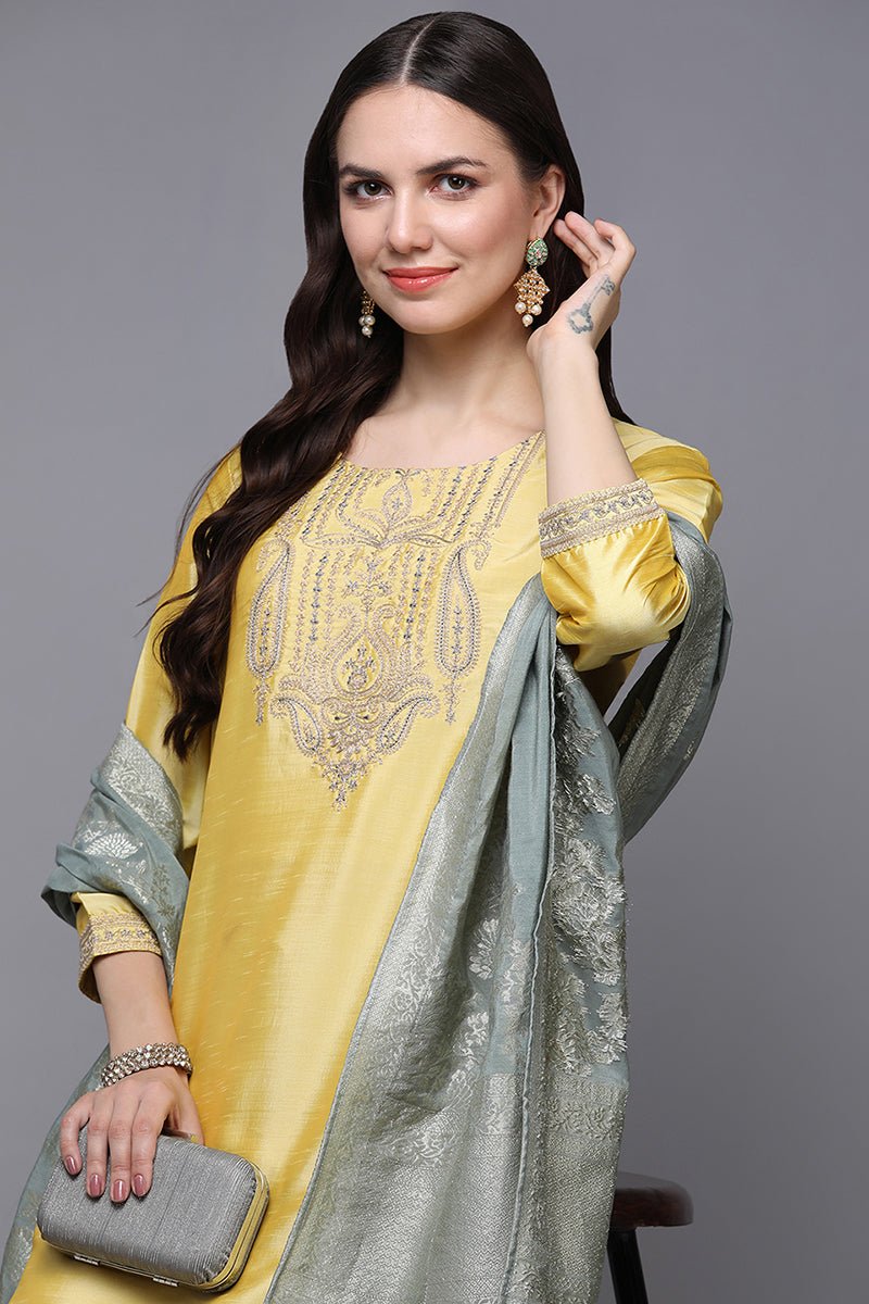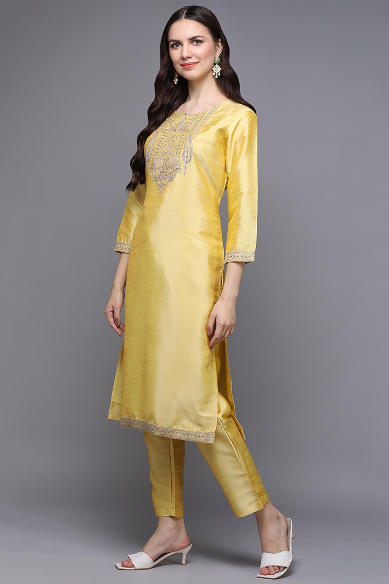 Ahika Yellow Poly Silk Floral Straight Suit Set
