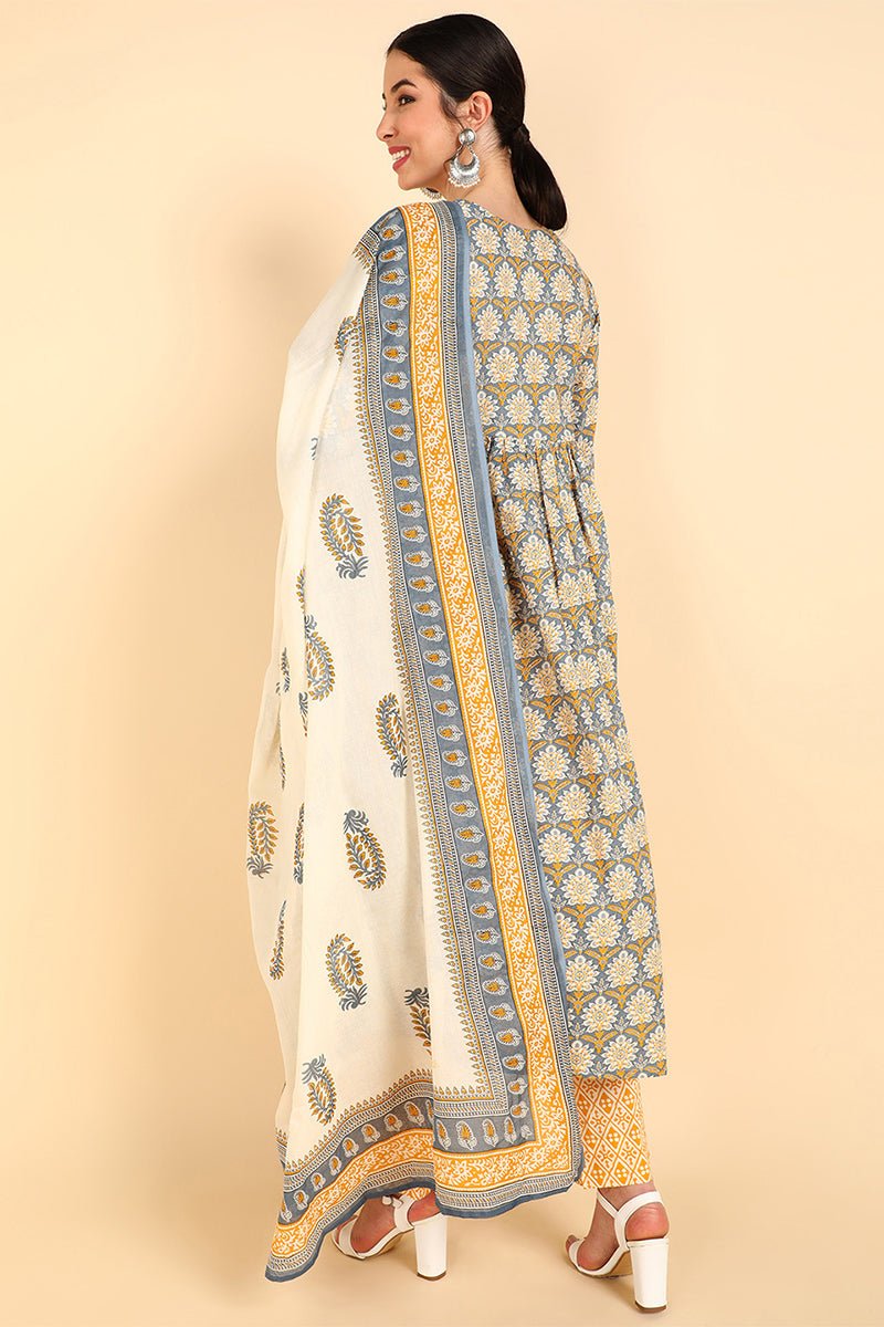 Ahika Yellow Pure Cotton Ethnic Motifs Printed Flared Style Suit Set