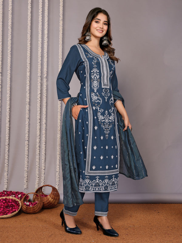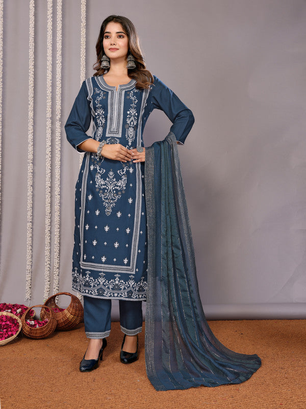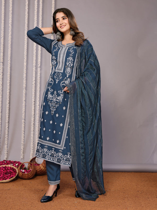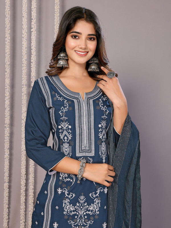 Malishka Women's Cotton Blend Printed Straight Kurta Pant With Dupatta - Teal Blue