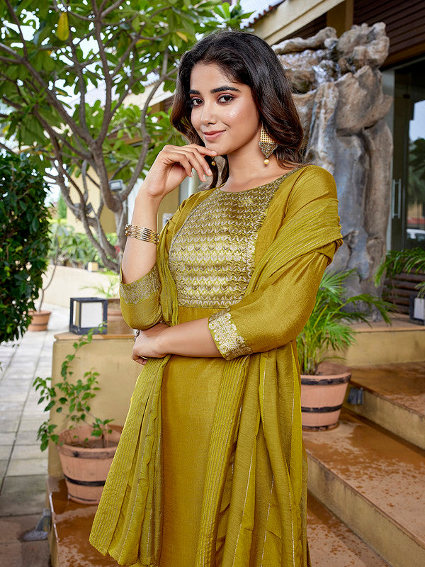 Malishka Women's Silk Blend Solid Straight Kurta Pant With Dupatta - Mustard