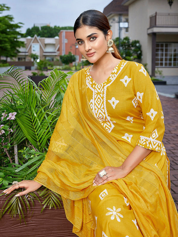 This Mustard Colour Kurta Set Is The Fun Attire Of The Moment. Get It On And Style It With A Handbag And Earrings For The Perfect Day Look. Its Casual Wear And Cute - The Essentials For Your Wardrobe. Package Content - 1 Kurta, 1pc Pant,1pc Dupatta, Made from Cotton Blend fabric having Printed work on it.