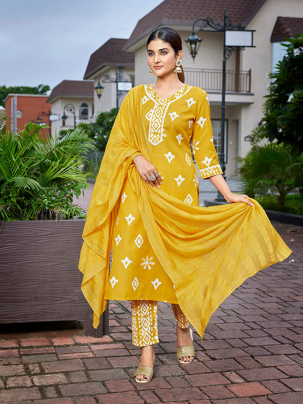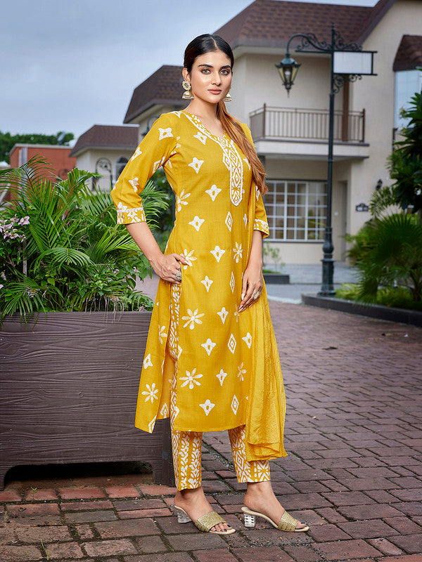 NOZ2TOZ Women's Cotton Blend Printed Straight Kurta Pant With Dupatta - Mustard