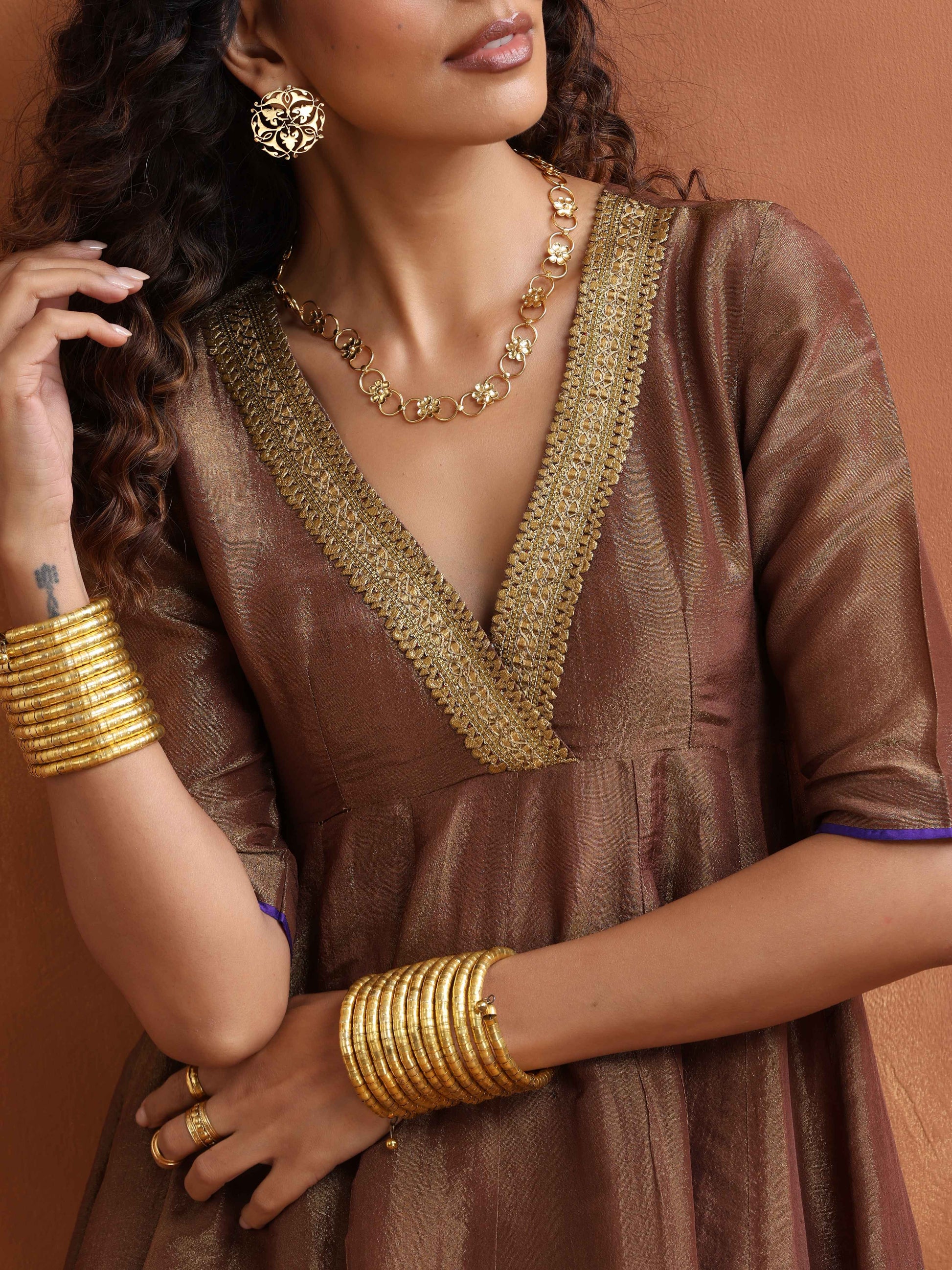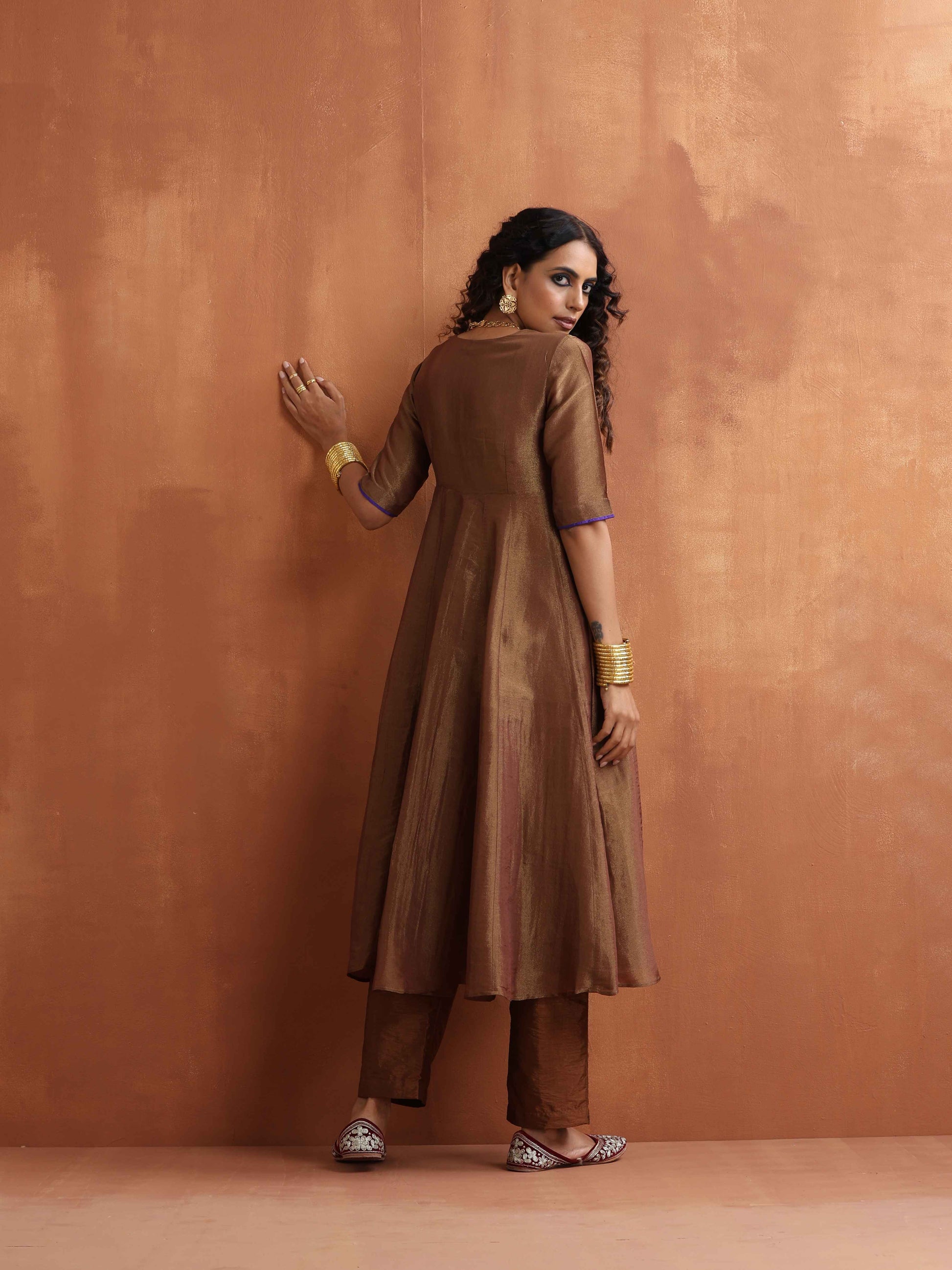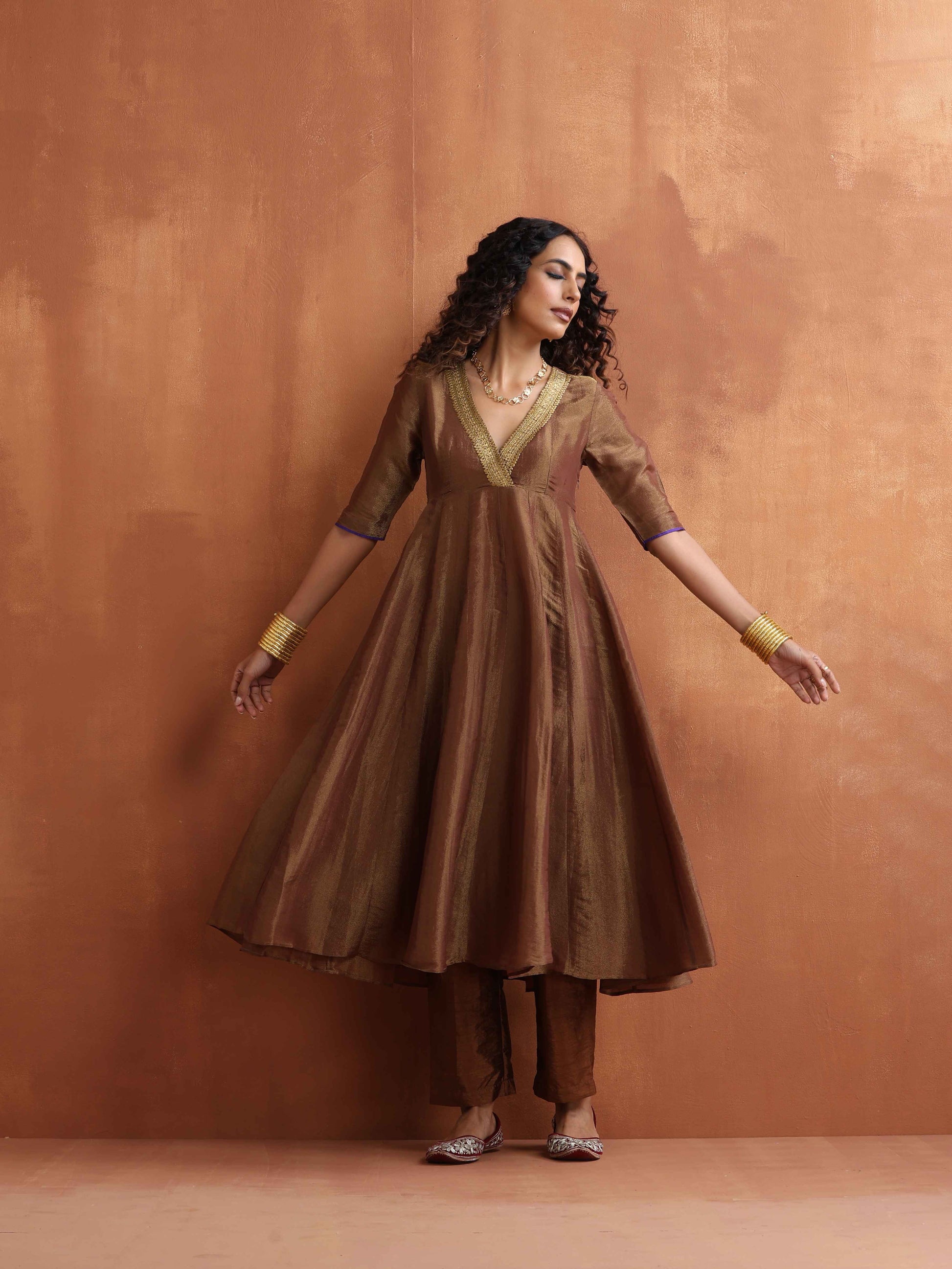 trueBrowns Bronze Tissue Flared Anarkali Kurta Set