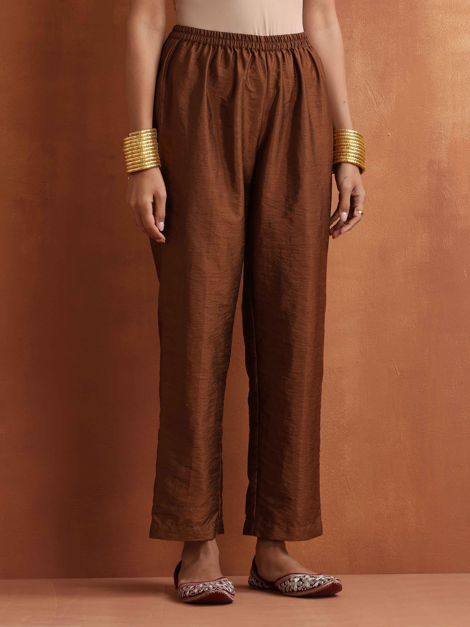 • Elevate your style with this dark brown tissue flared anarkali kurta paired perfectly with dark brown silk blend elasticated waist pants