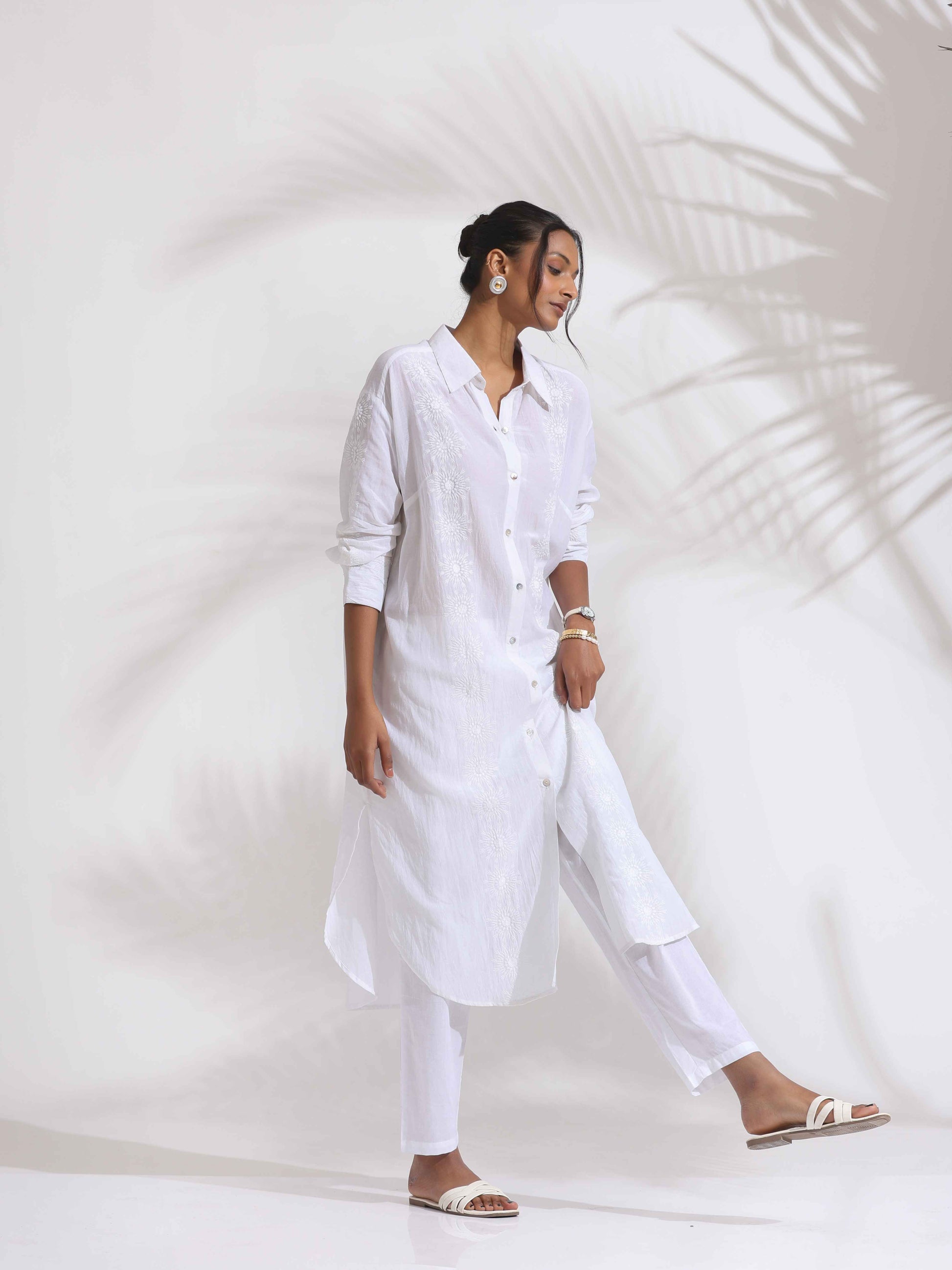 trueBrowns White Cotton Schiffli Shirt Kurta Set