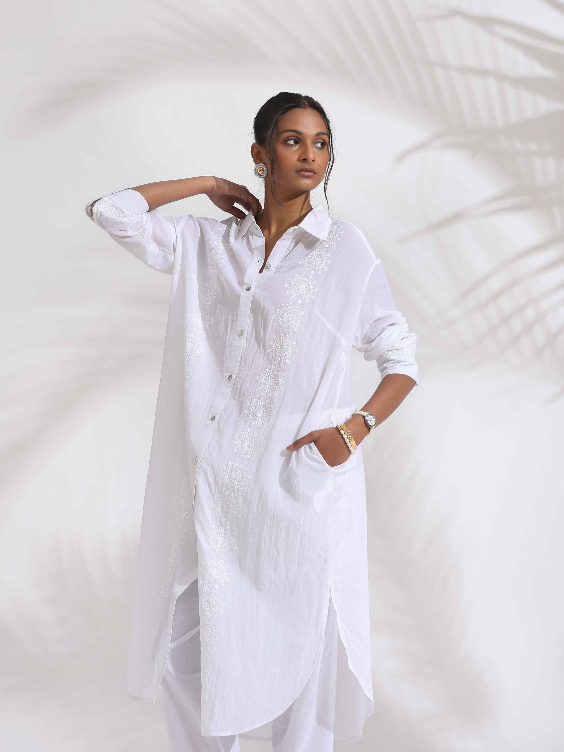 • Elevate your style with this white cotton oversized shirt kurta, beautifully detailed with intricate embroidery on the front and sleeves with a solid back. The slightly sheer fabric adds a touch of lightness and elegance, paired with white pants.