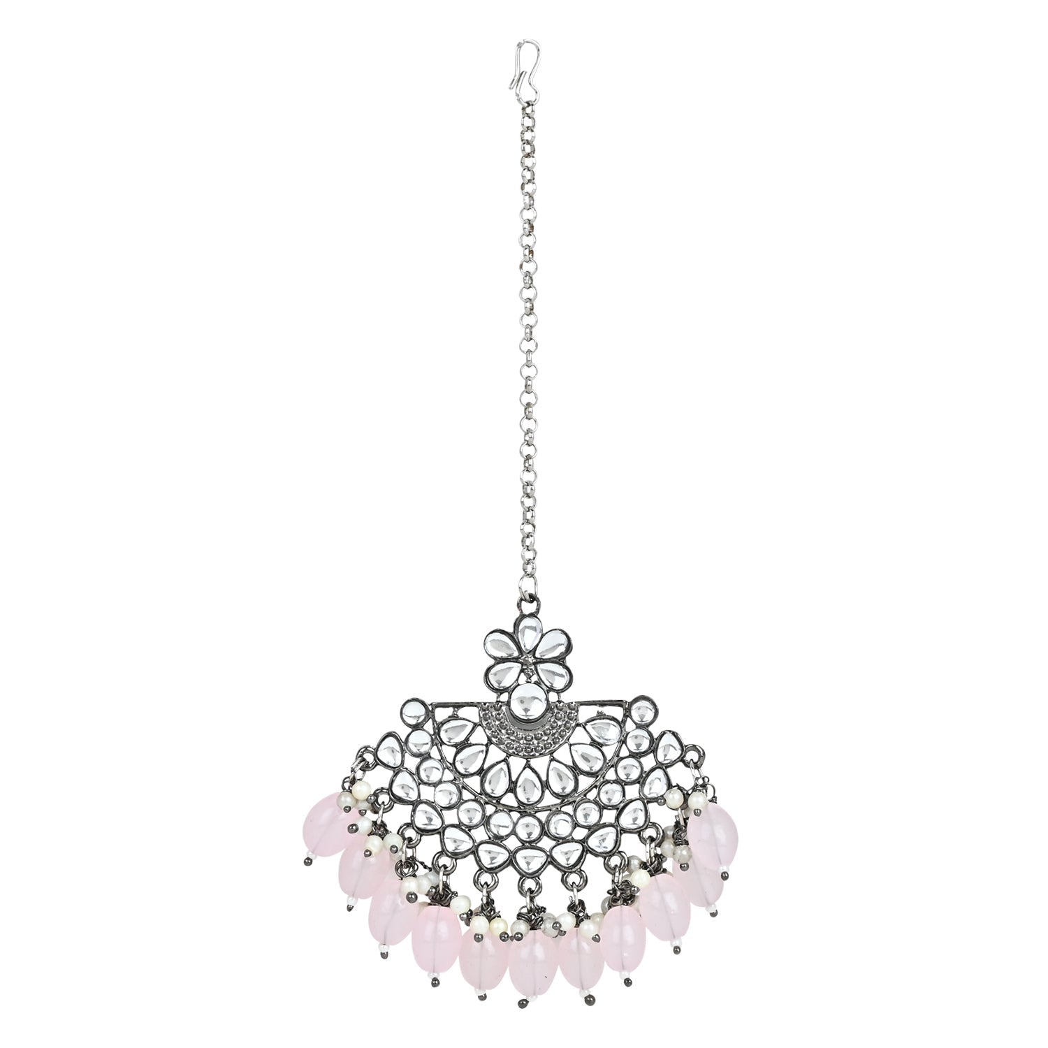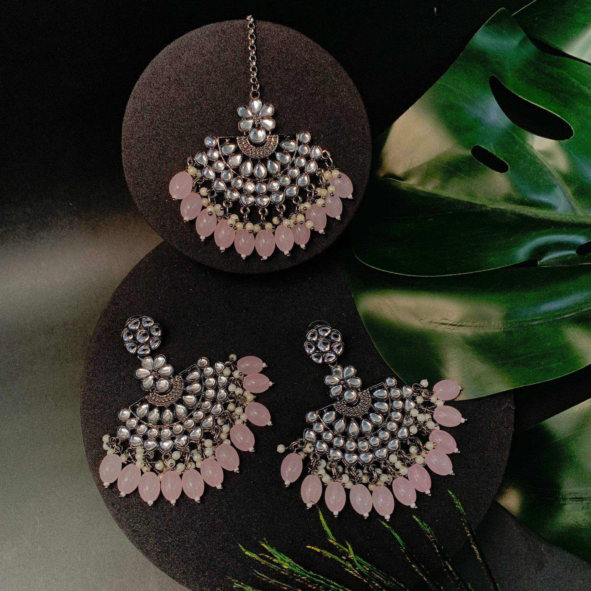 Ethnic Stylish Silver Oxidised Kundan Pearl Chandbali Earrings With Maang Tikka Set For Women And Girls - Wahe Jewels