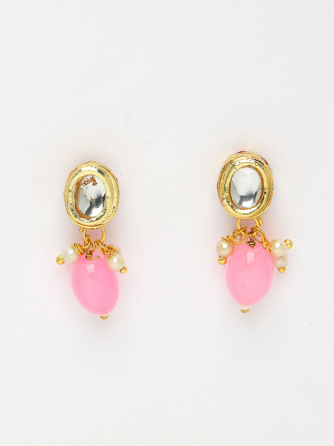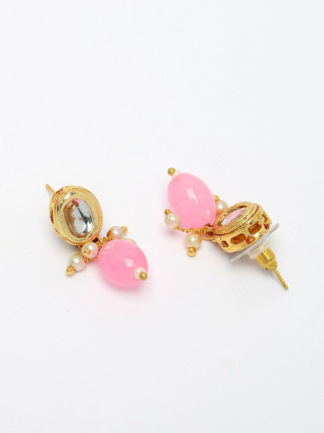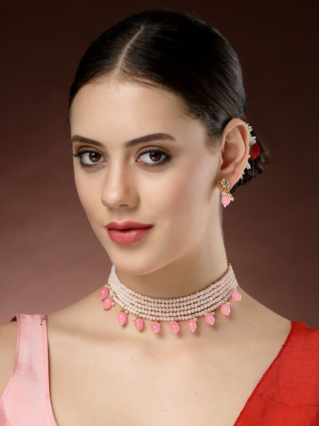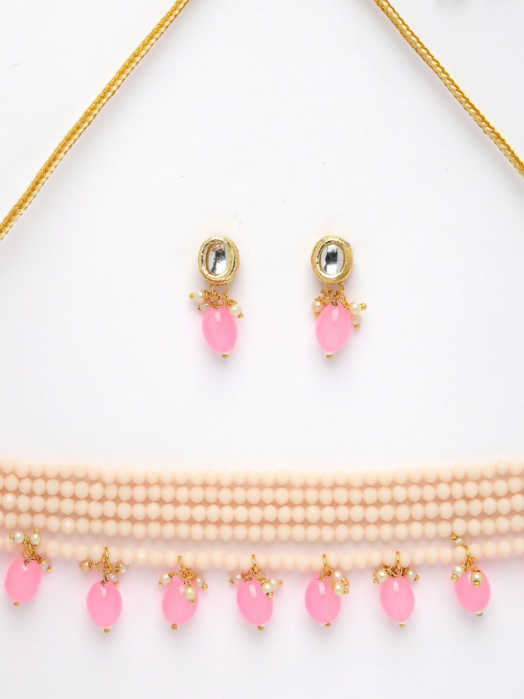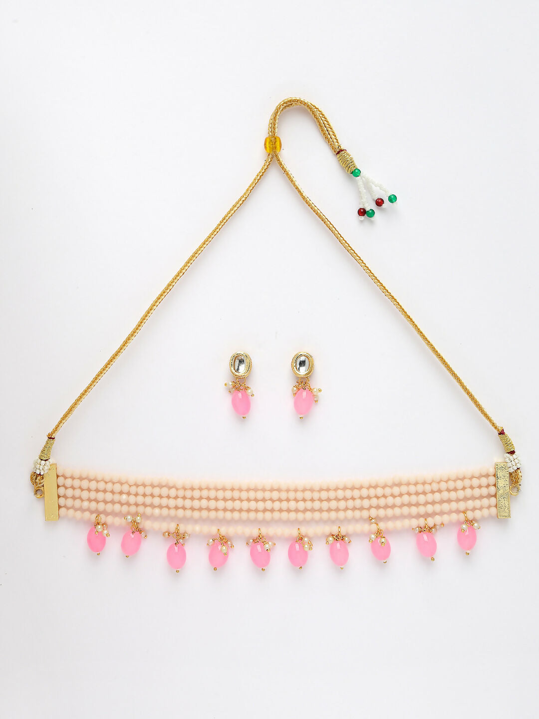 NVR Women's Pink Artificial Beads Layered Necklace with Drop Earring