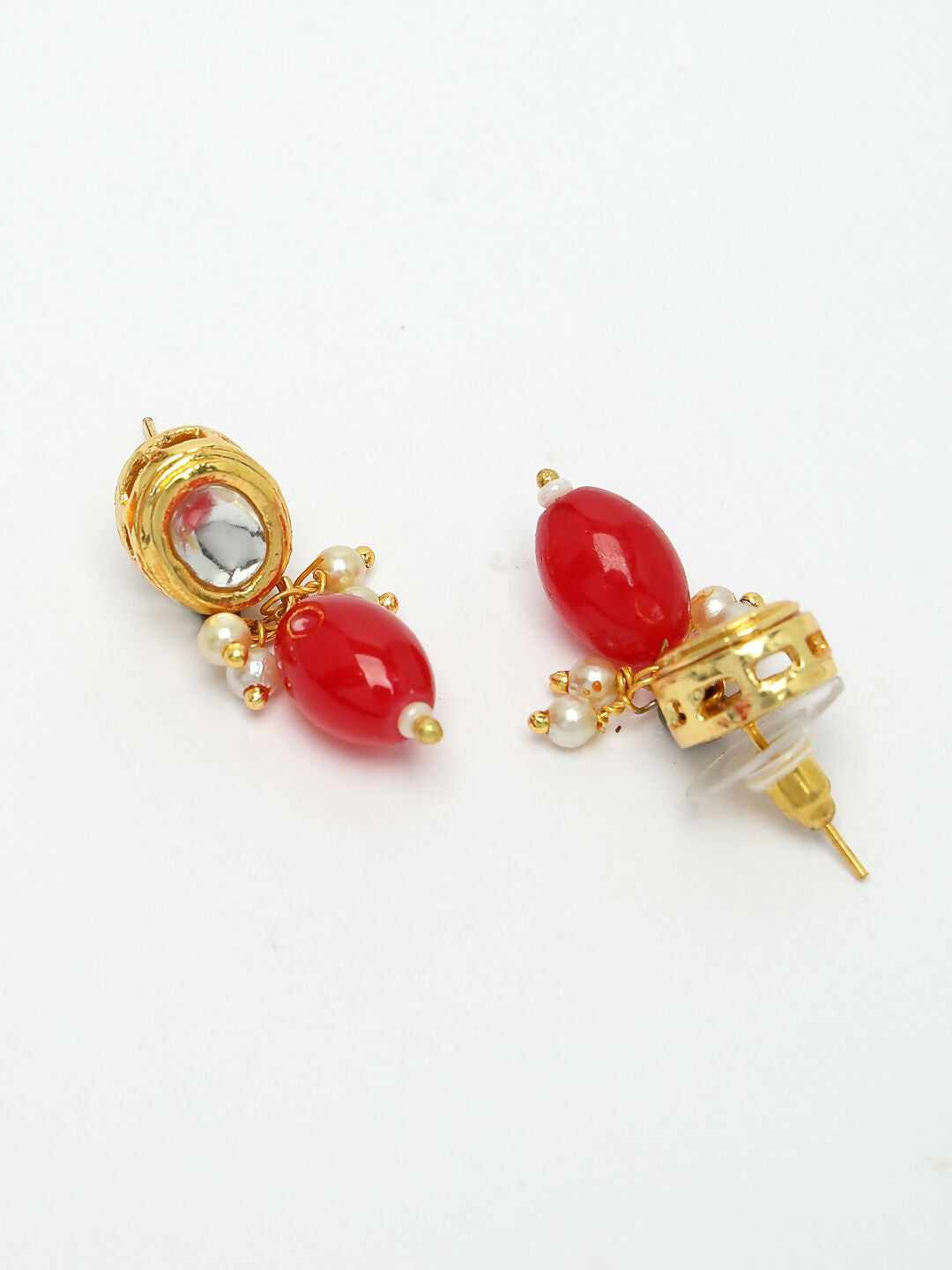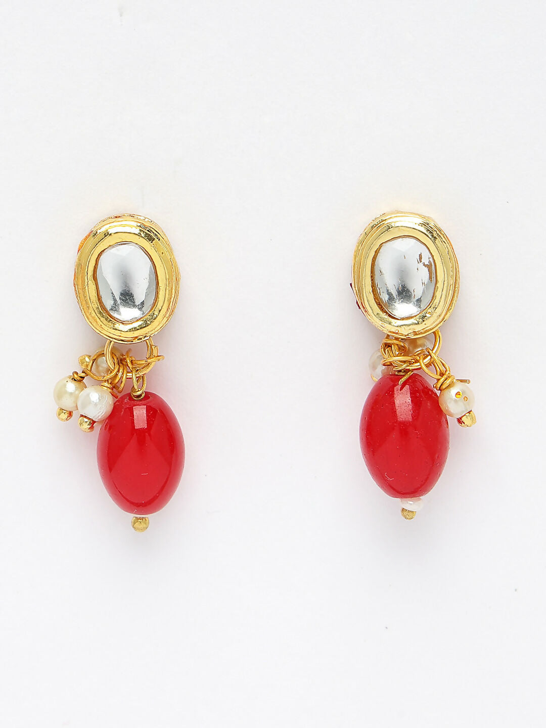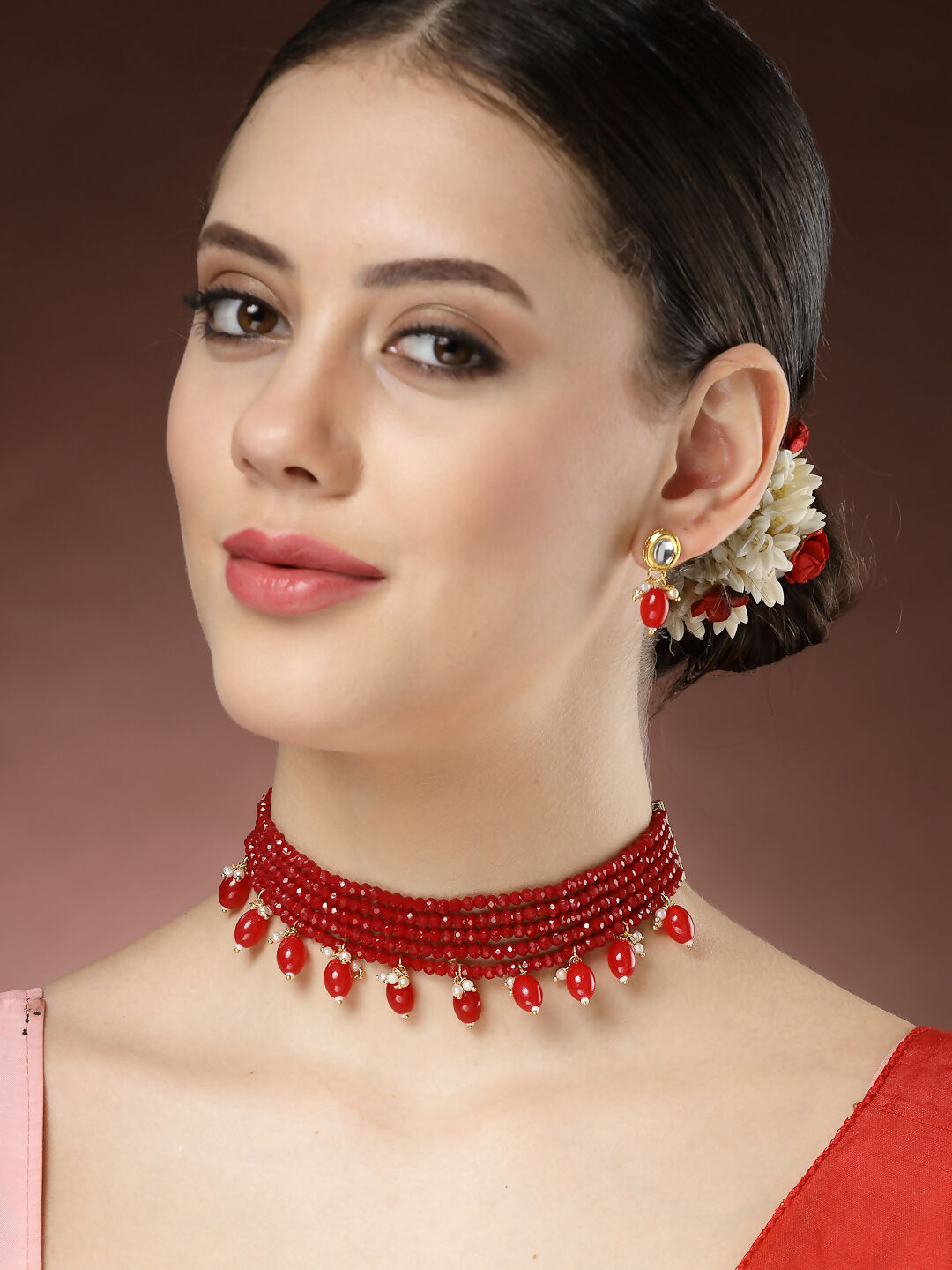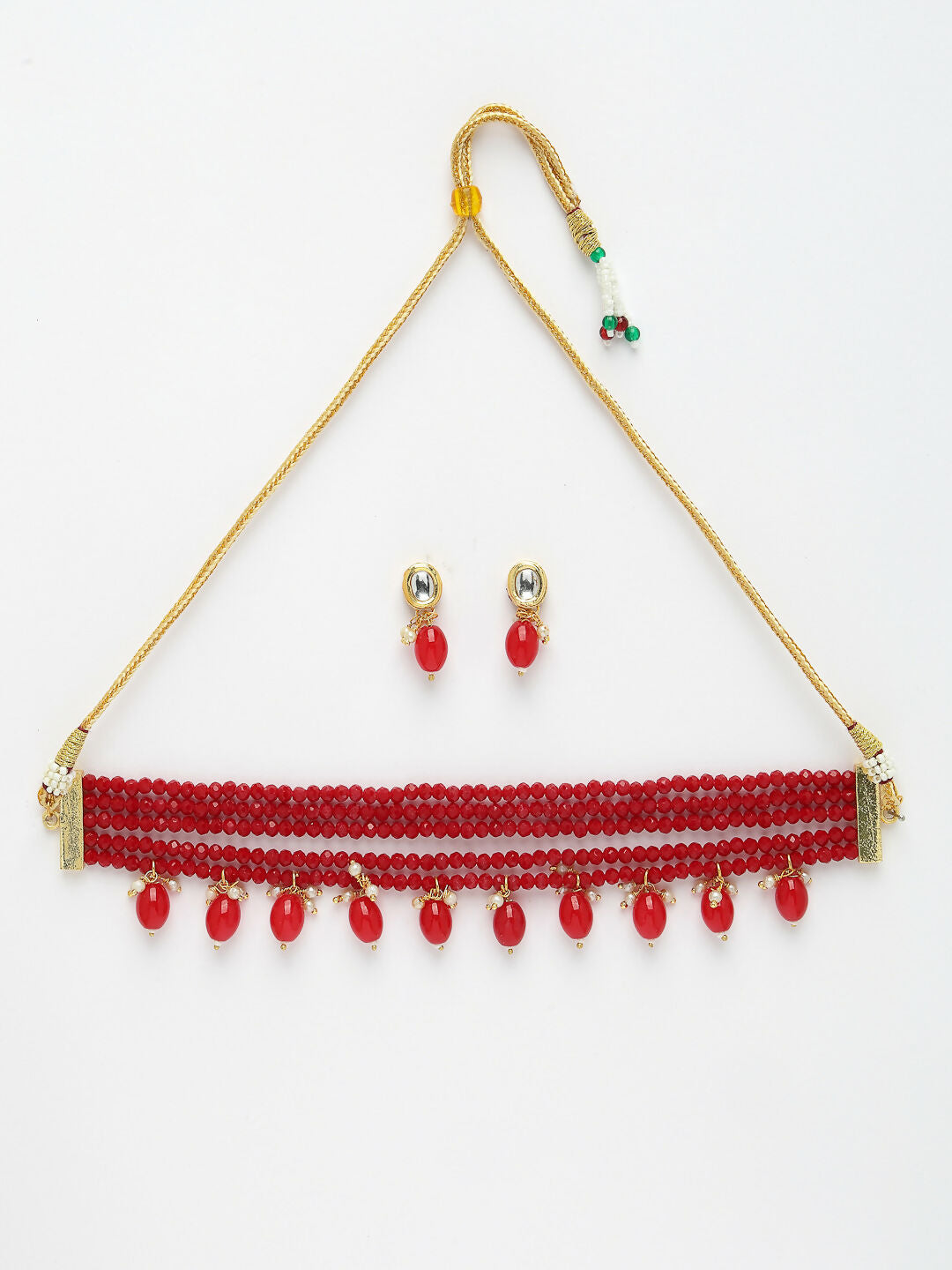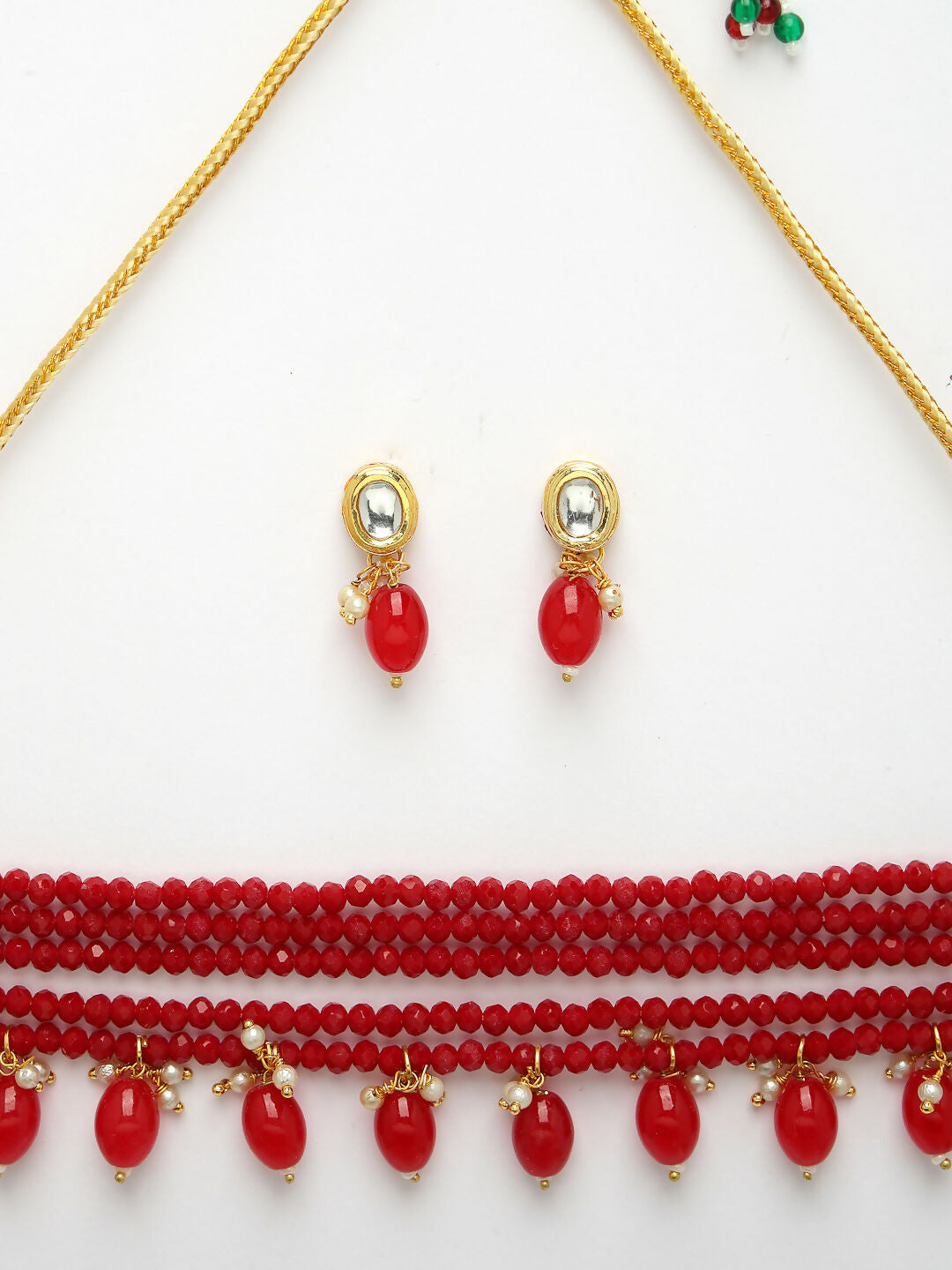 NVR Women's Red Artificial Beads Layered Necklace with Drop Earring