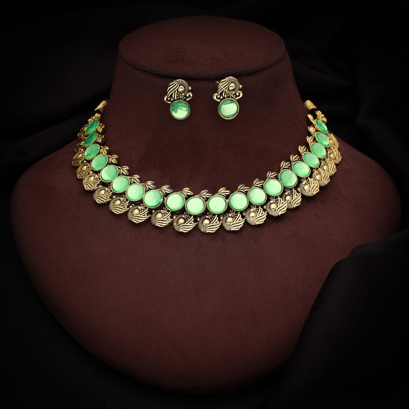 Tehzeeb Creations Sea Green Colour Gold-Polished Stone Jewellery Choker Necklace Set With Matching Pair of Stud Earrings