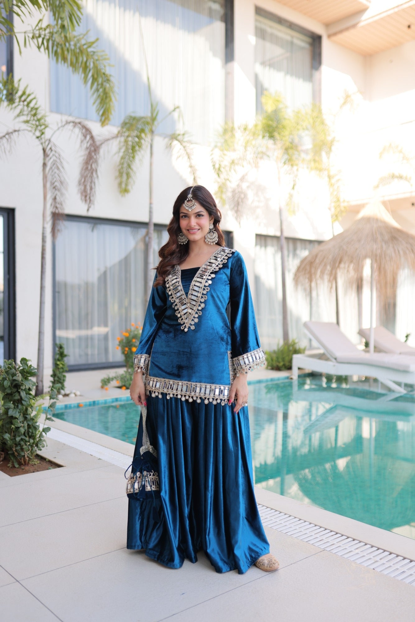 Lorenvalley Fashion Rama Velvet with Rich Zari Embroidered & Real Mirror work Kurta Palazzo with Dupatta