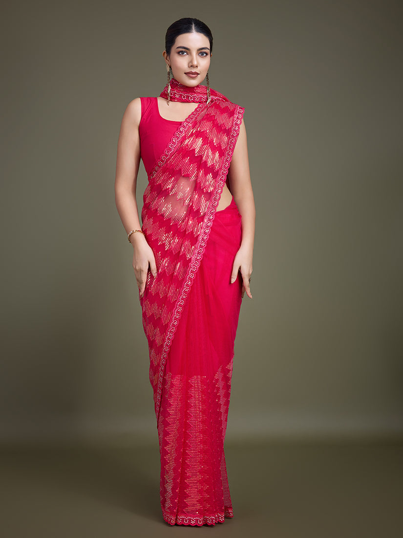 Monjolika Fashion Sequin Dark Pink Color Net Ultimate Party Wear Fashion Saree